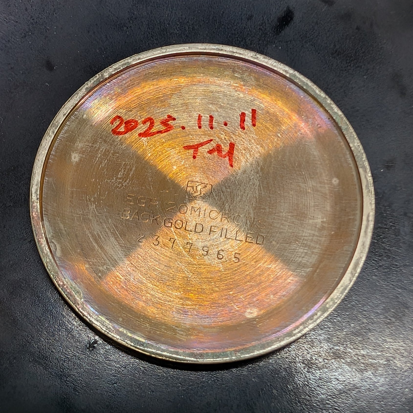 20 microns, gold plated case is in very good condition, with no gold chipping or peeling anywhere.