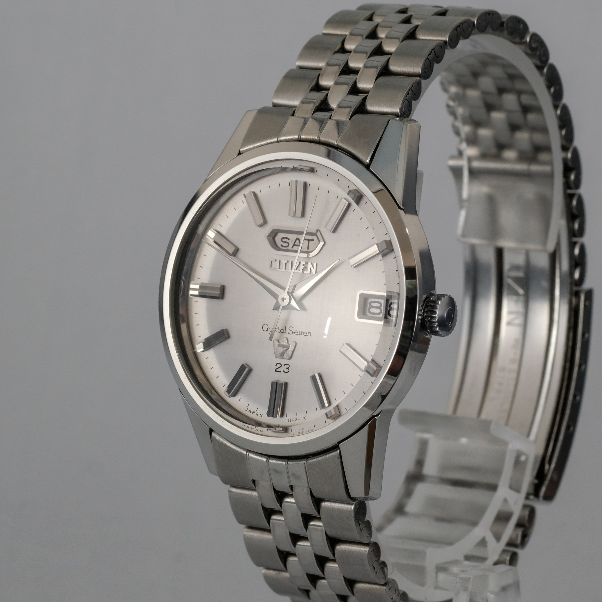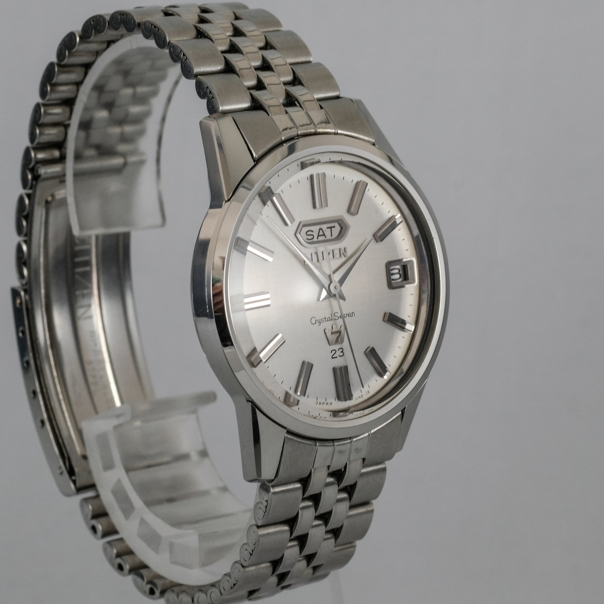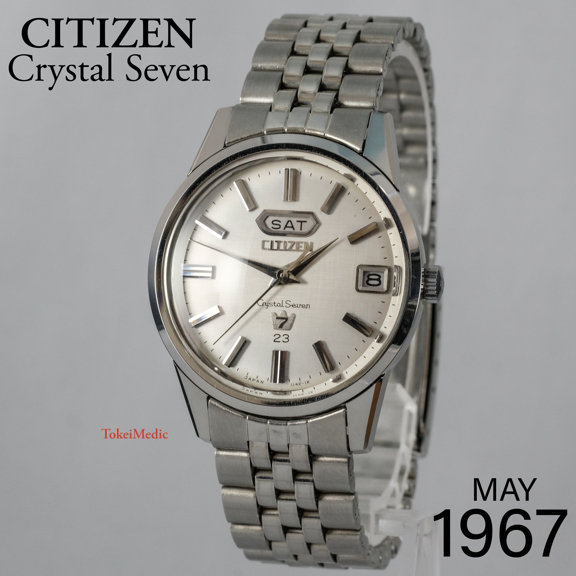 Striking, just serviced, 1967 Citizen Crystal Seven, 23 jewels automatic watch in all original, mint condition.
