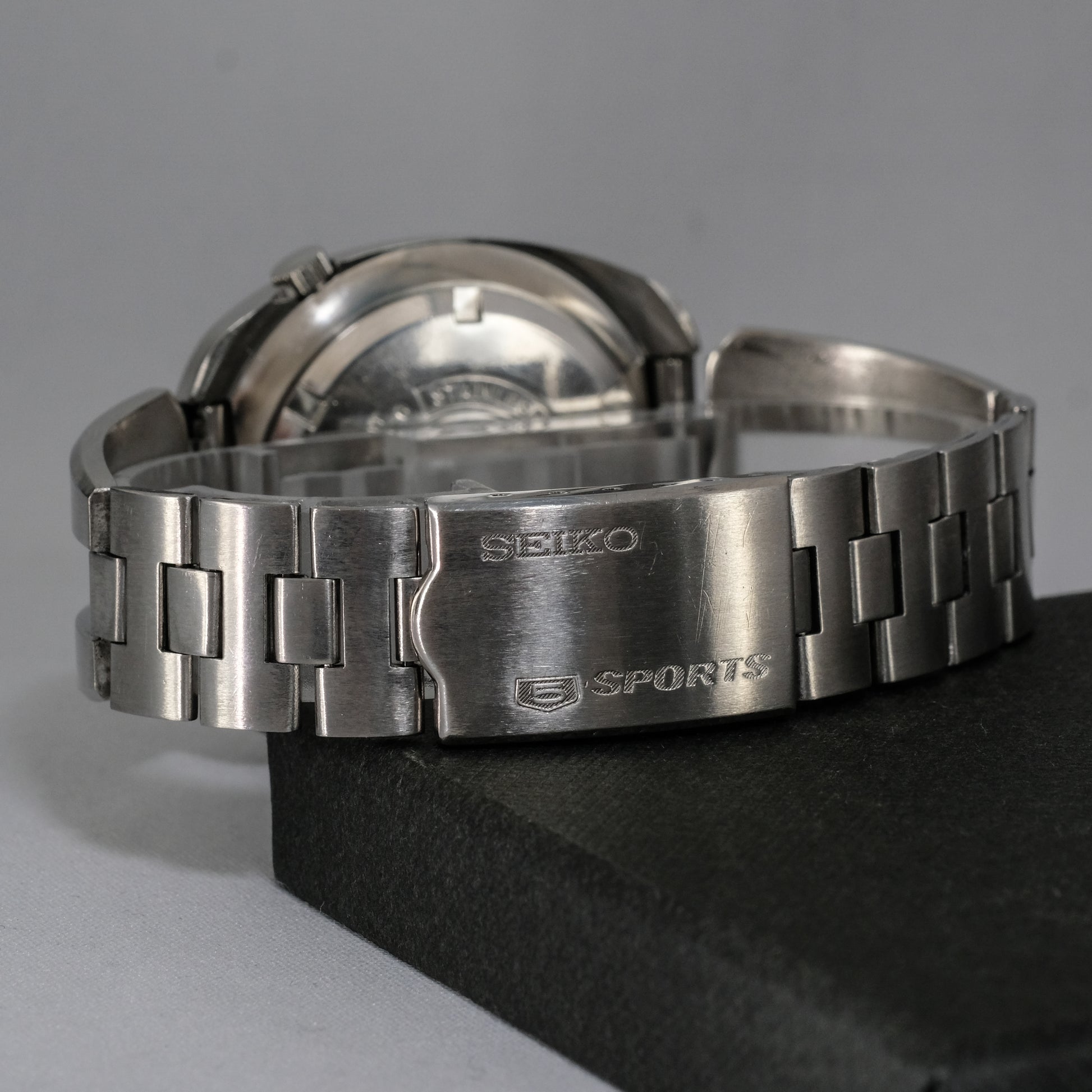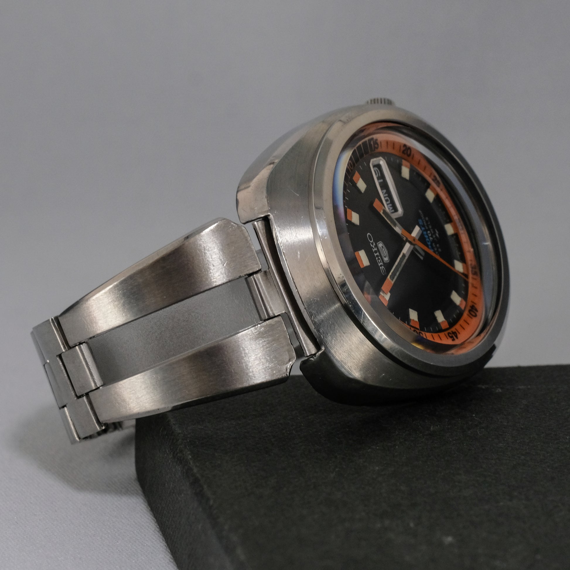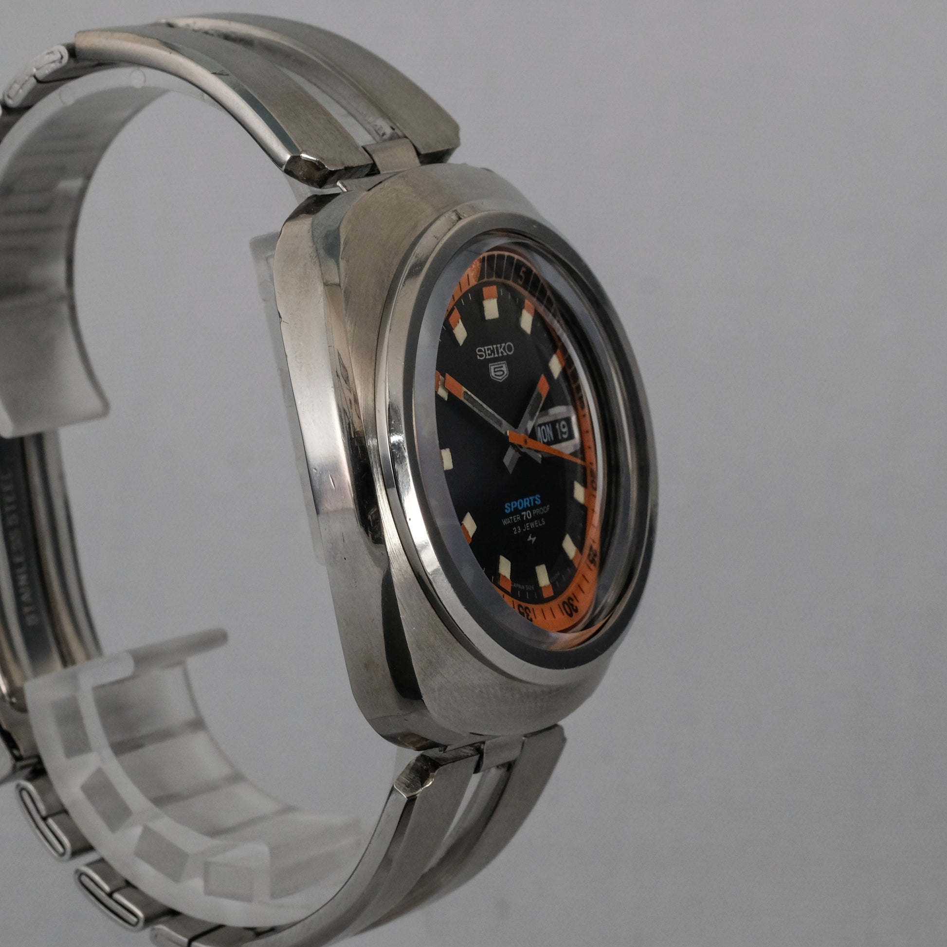 Serviced, rare find, Seiko 5 Sport with a black and orange dial, on original stainless steel bracelet, in beautiful condition. This model was part of the second wave of Seiko 5 Sports watches, designed primarily for the Japanese domestic market (JDM), and showcased distinctive design elements and technical features.