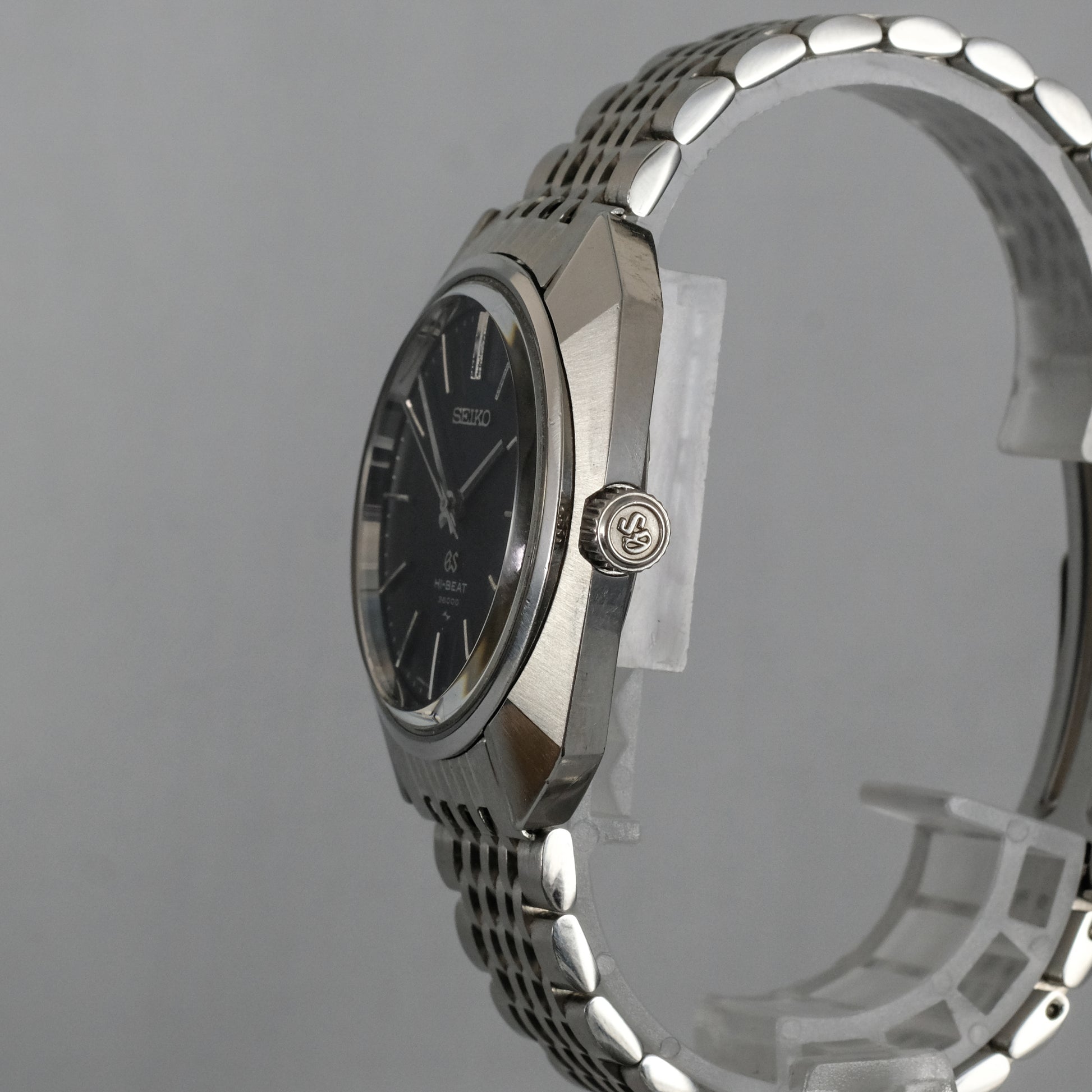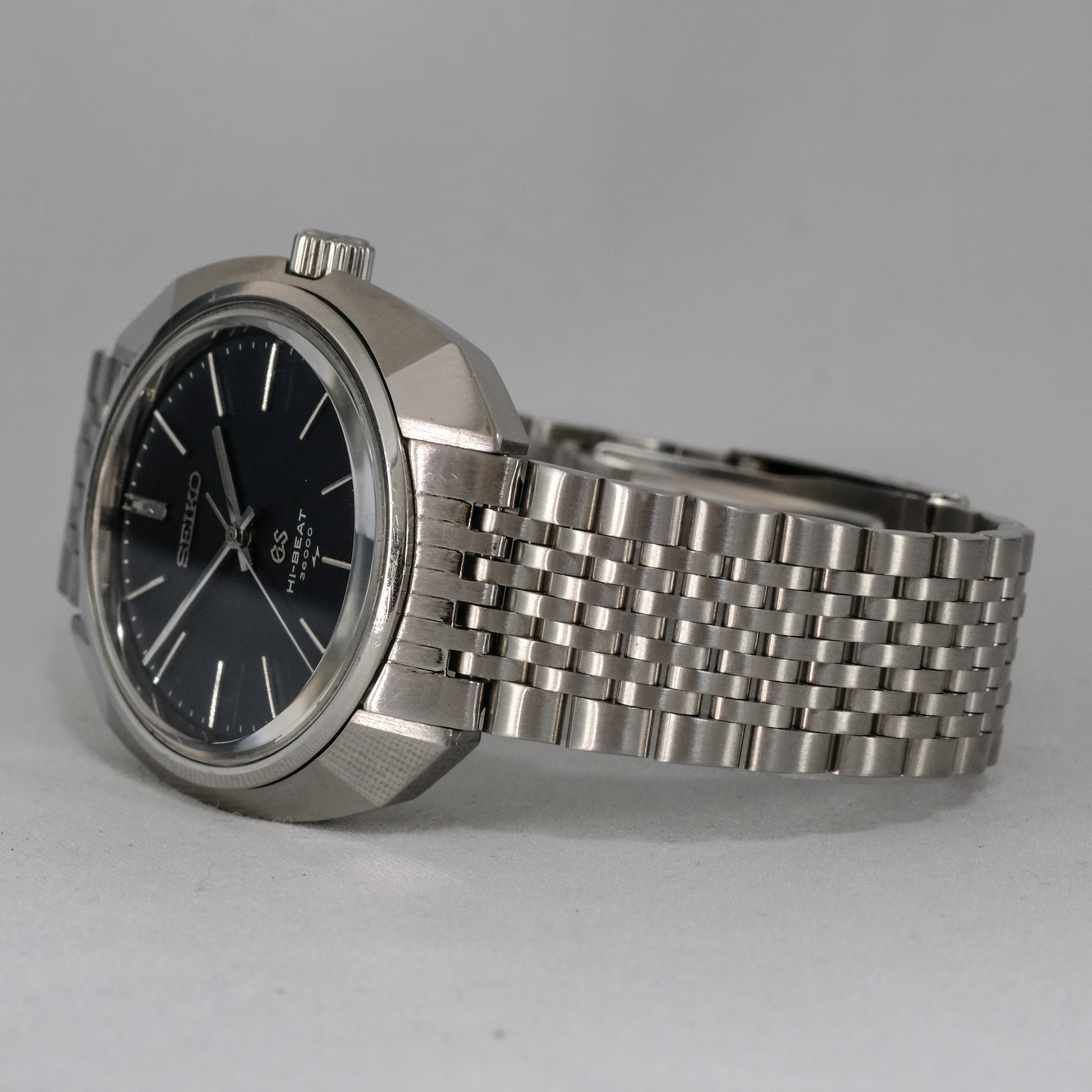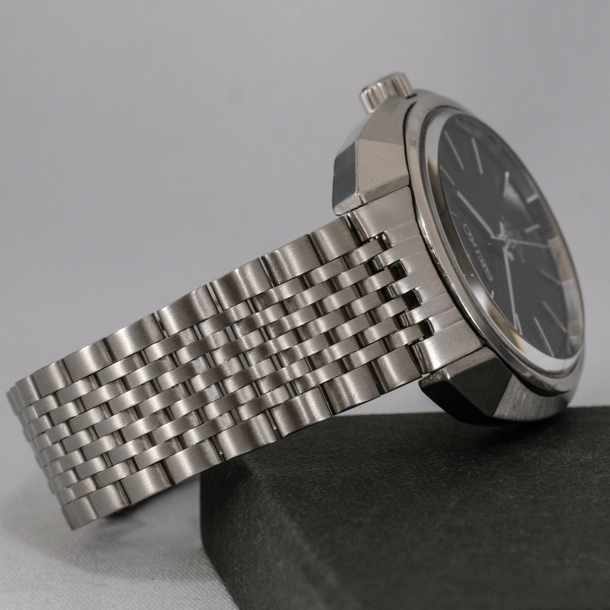 On a new, aftermarket, solid link, stainless steel bracelet with genuine, vintage Seiko buckle.
