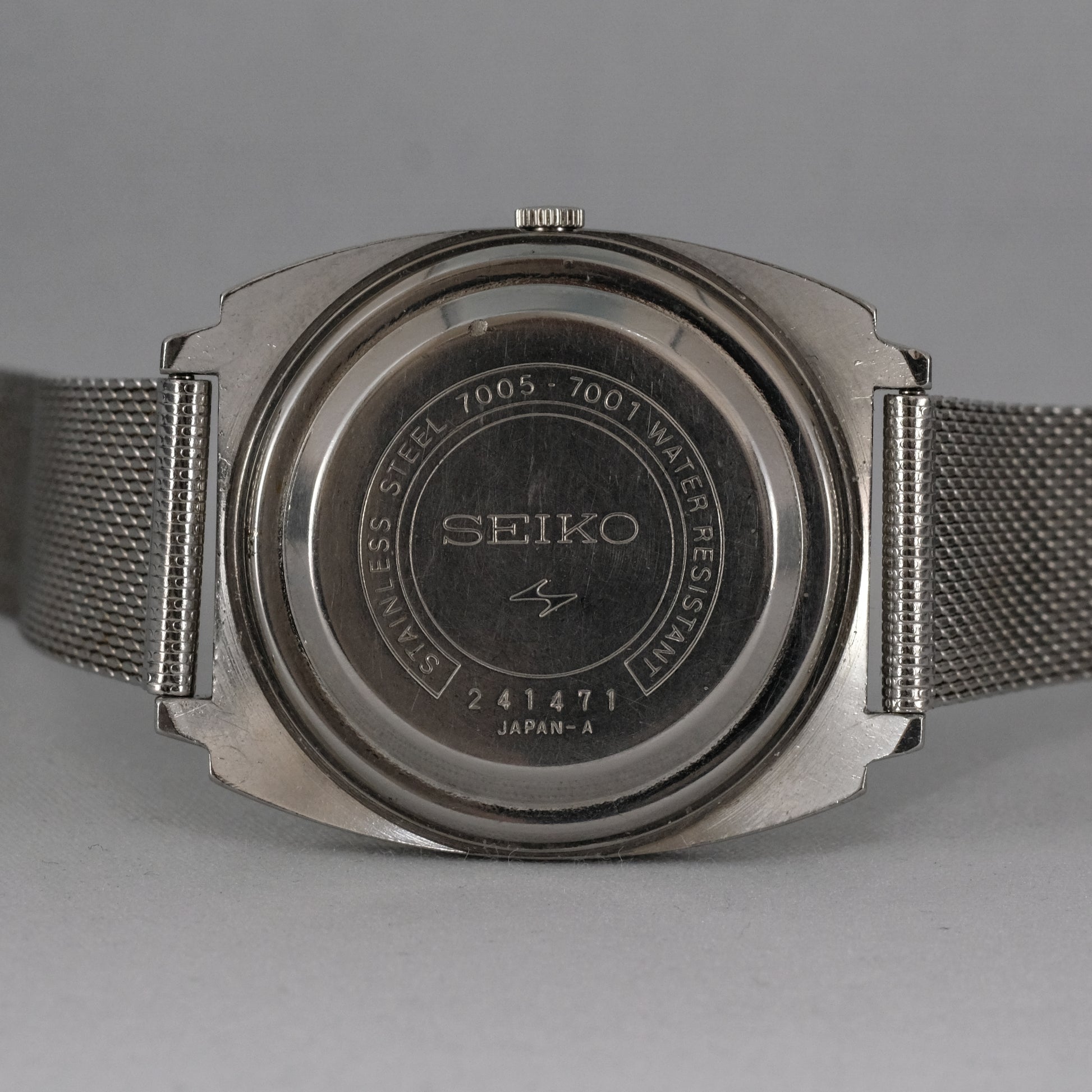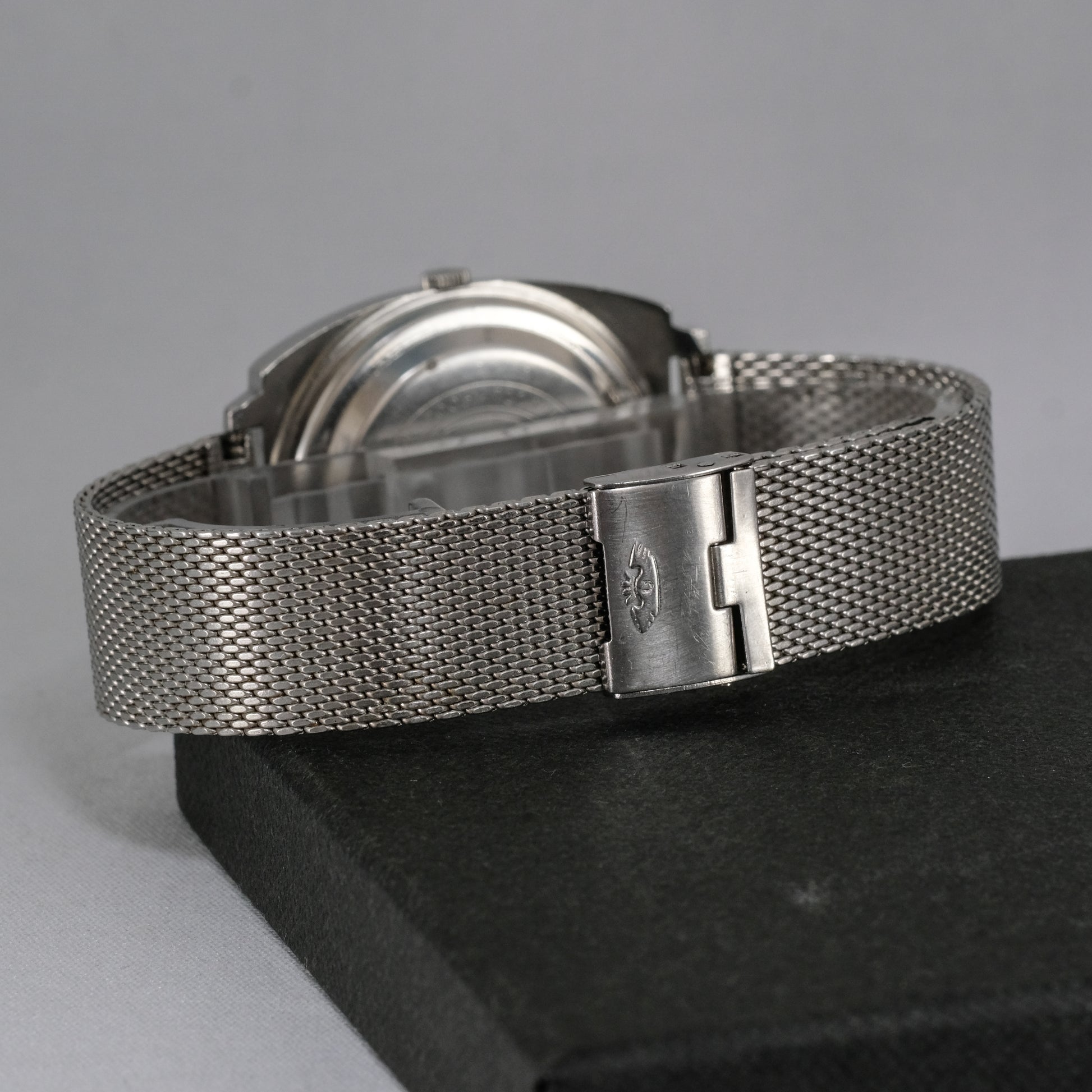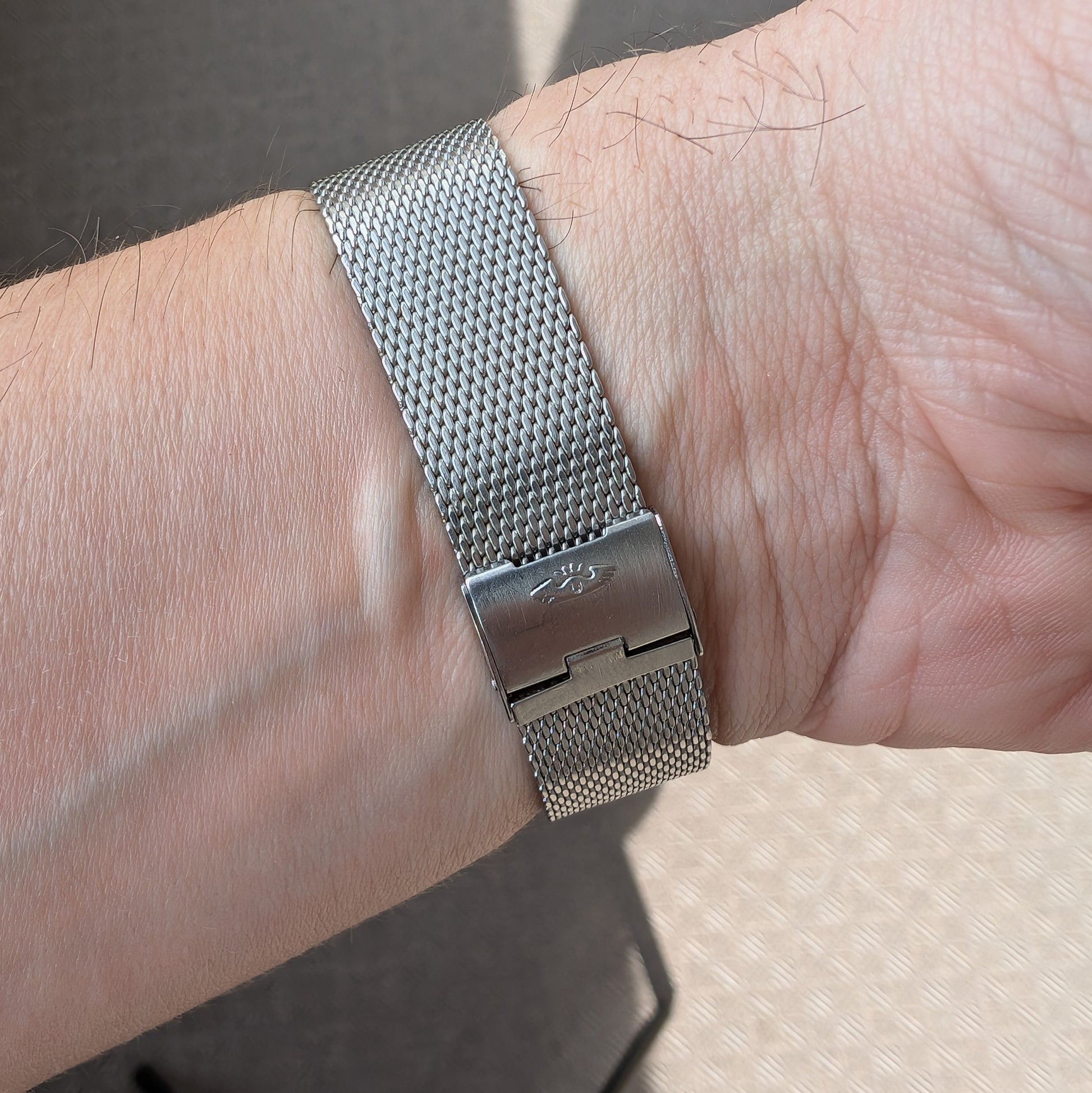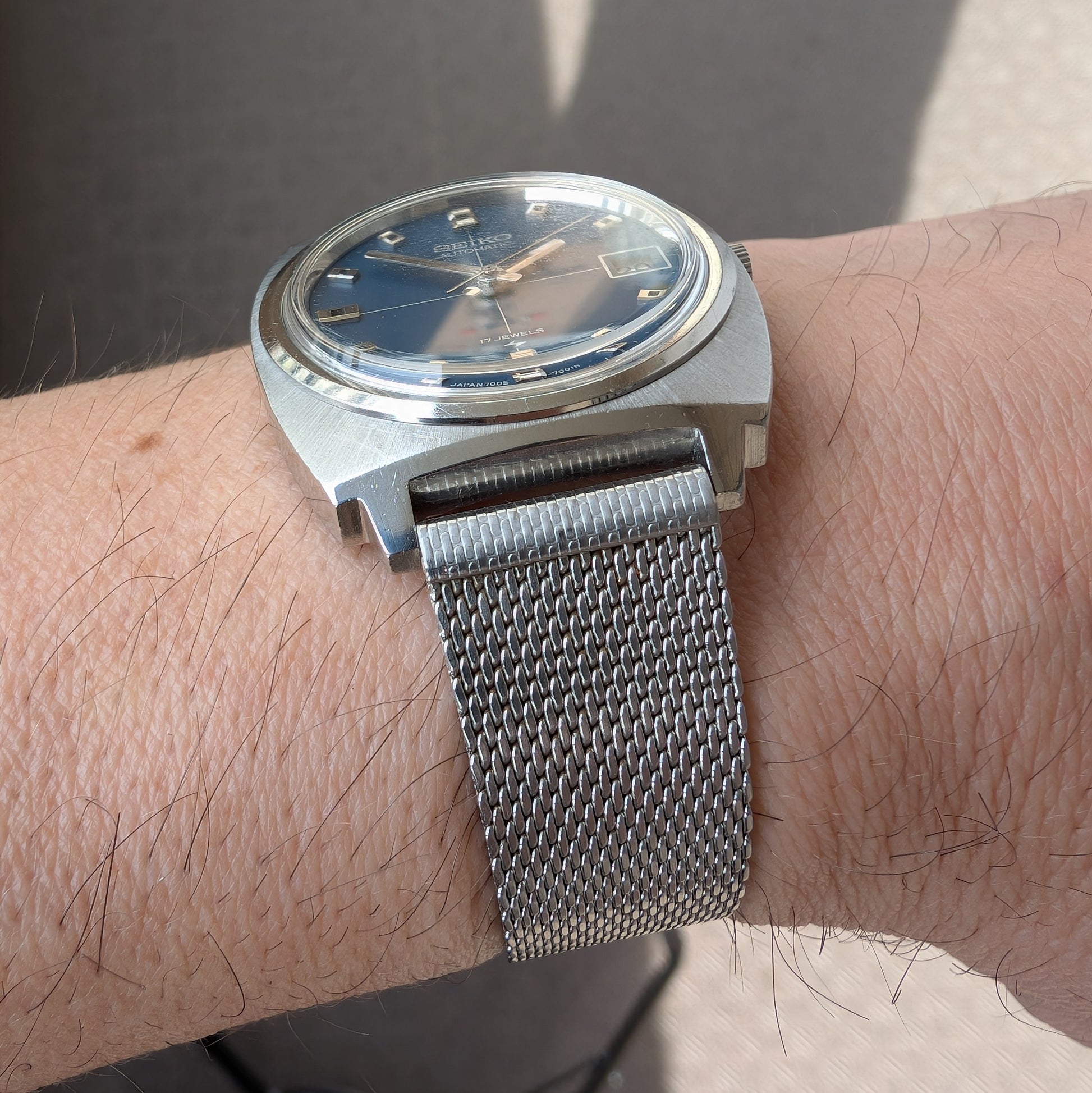Aftermarket, mesh, stainless steel bracelet. Easily adjusted to any size. It can be swapped for Seiko cowhide leather strap of your choice.