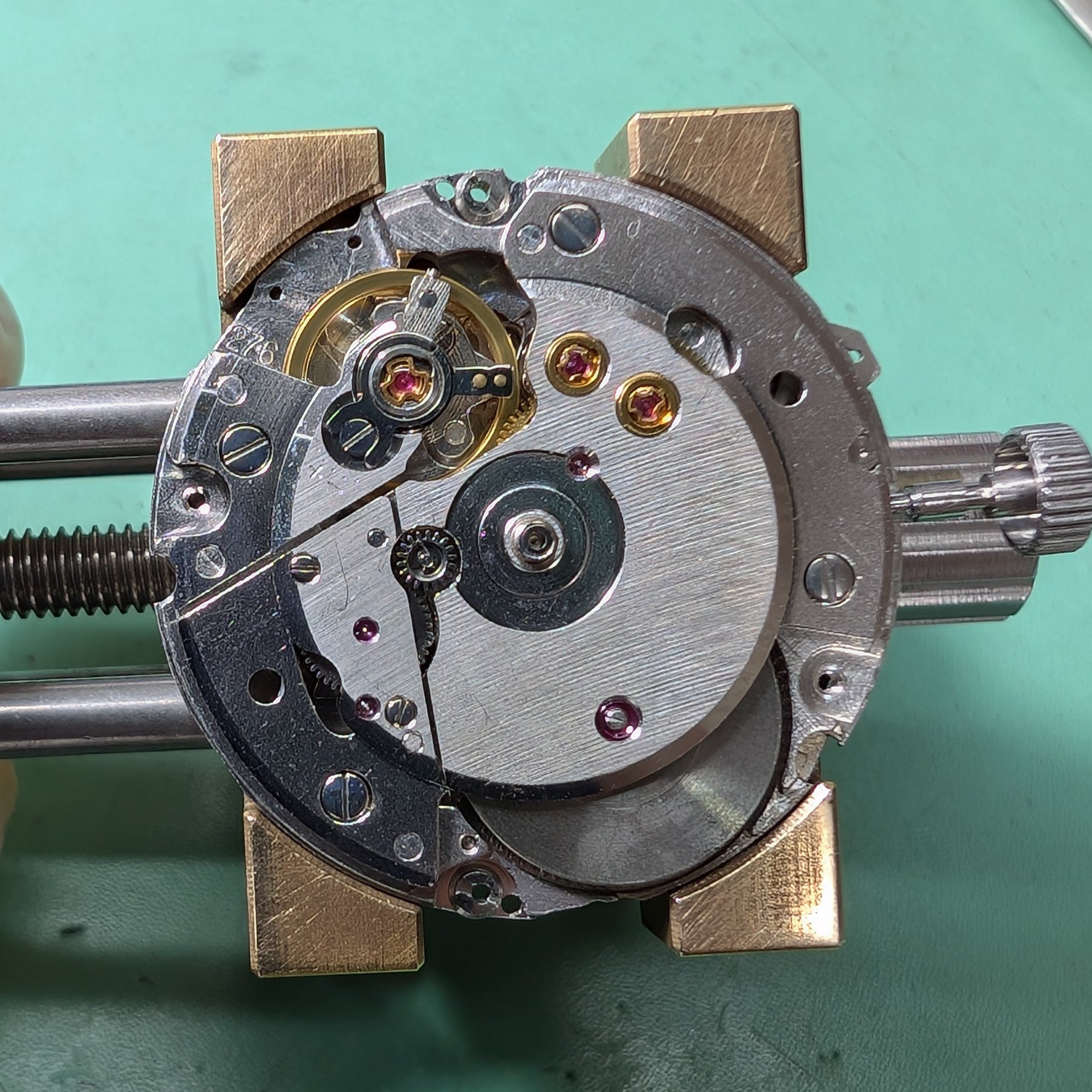 High end caliber 5246 ticks at 28800 BPH. It features automatic and manual winding with hacking and day/date quick set with crown pulled one step.