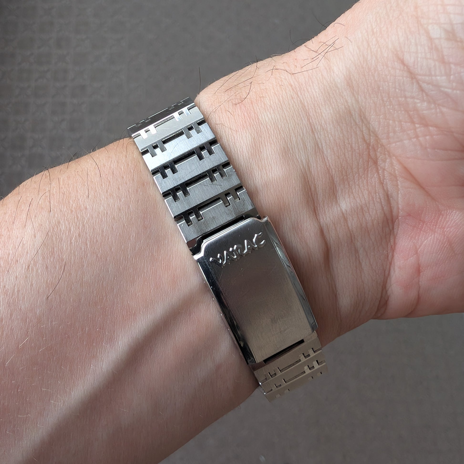 High grade, thick, solid link, original stainless steel bracelet. Sized to 18.5cm.