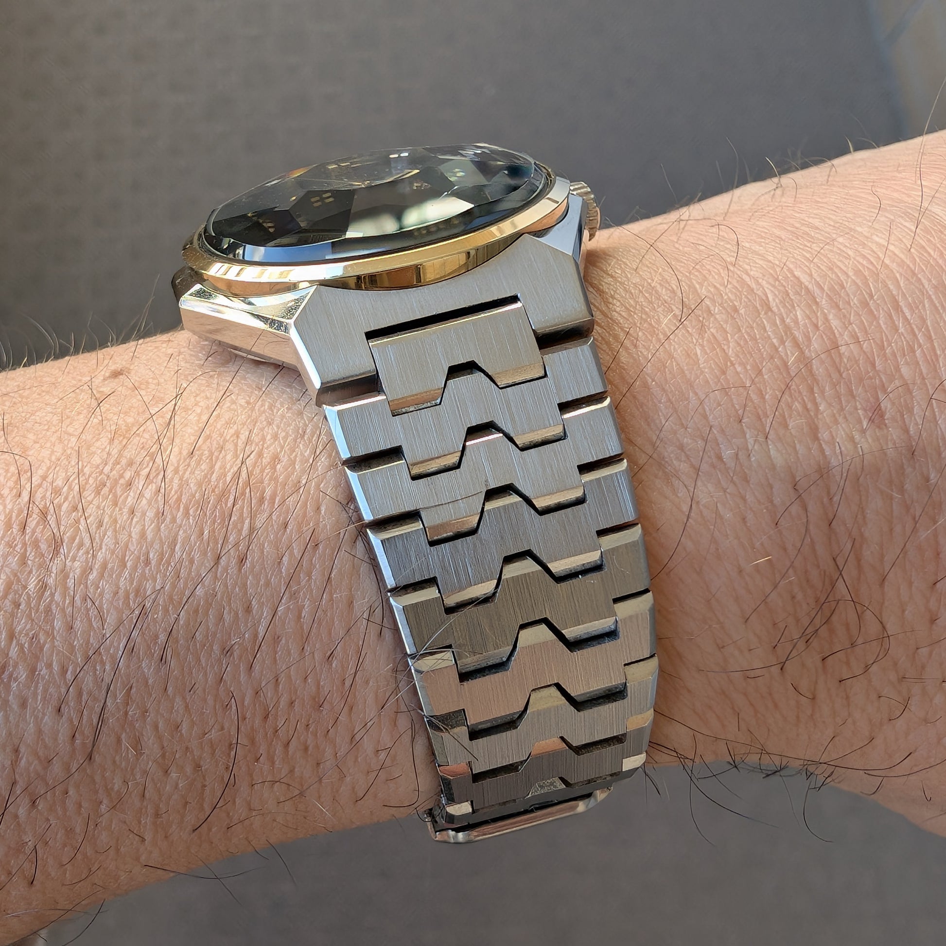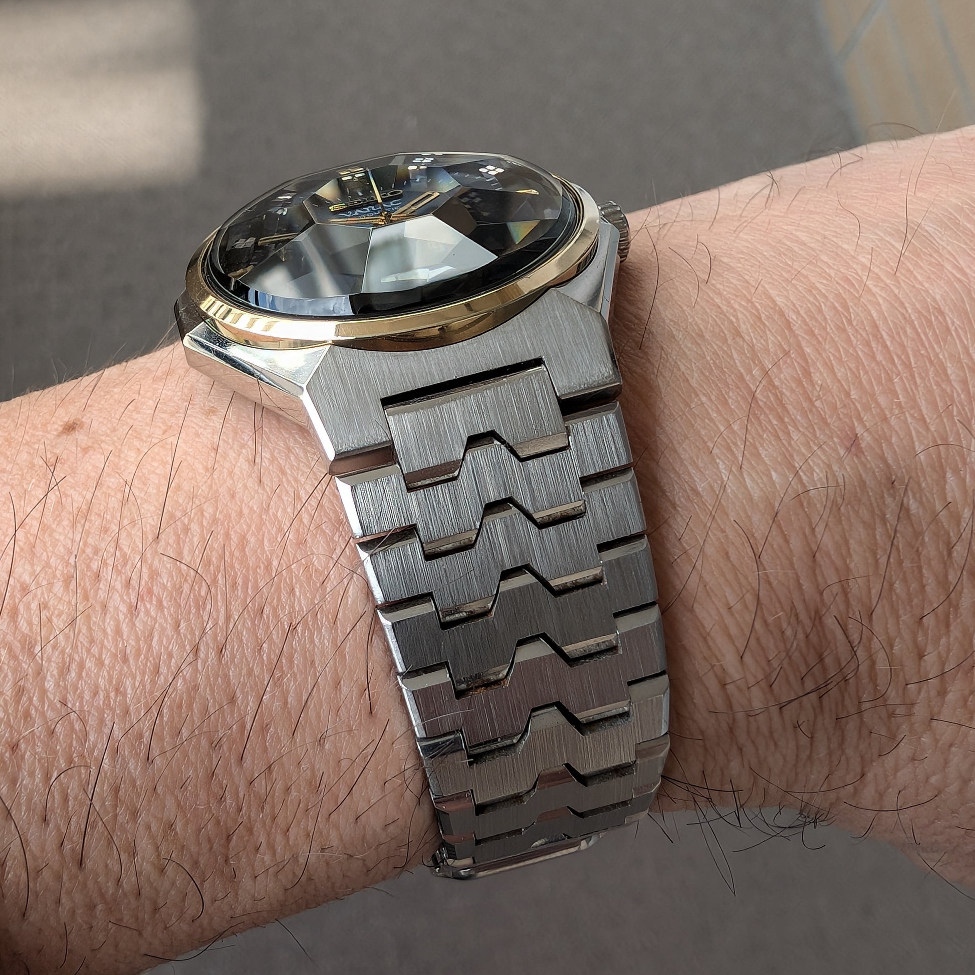 High grade, nicely integrated stainless steel bracelet. Sized to little over 17cm. Extension can be added for more length.