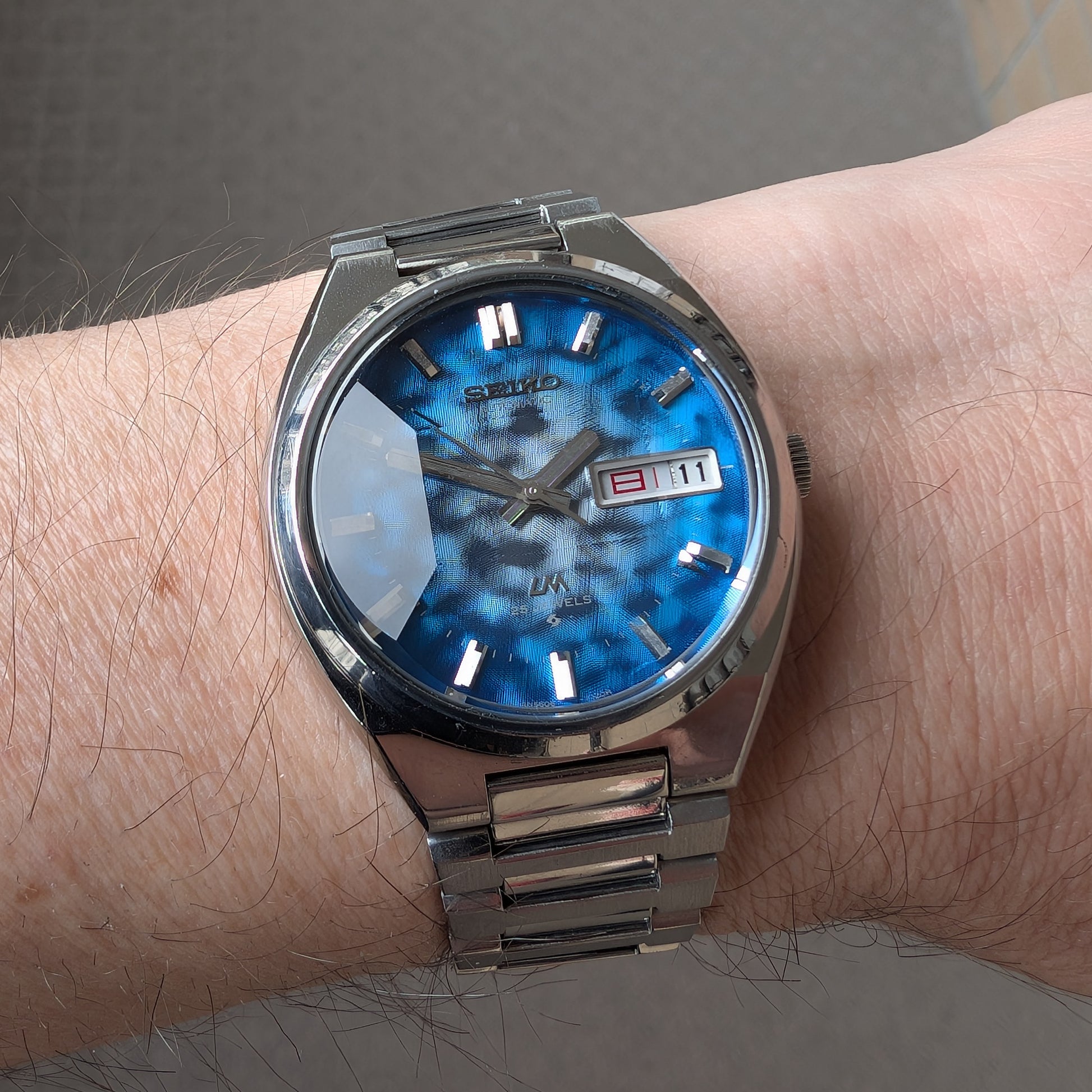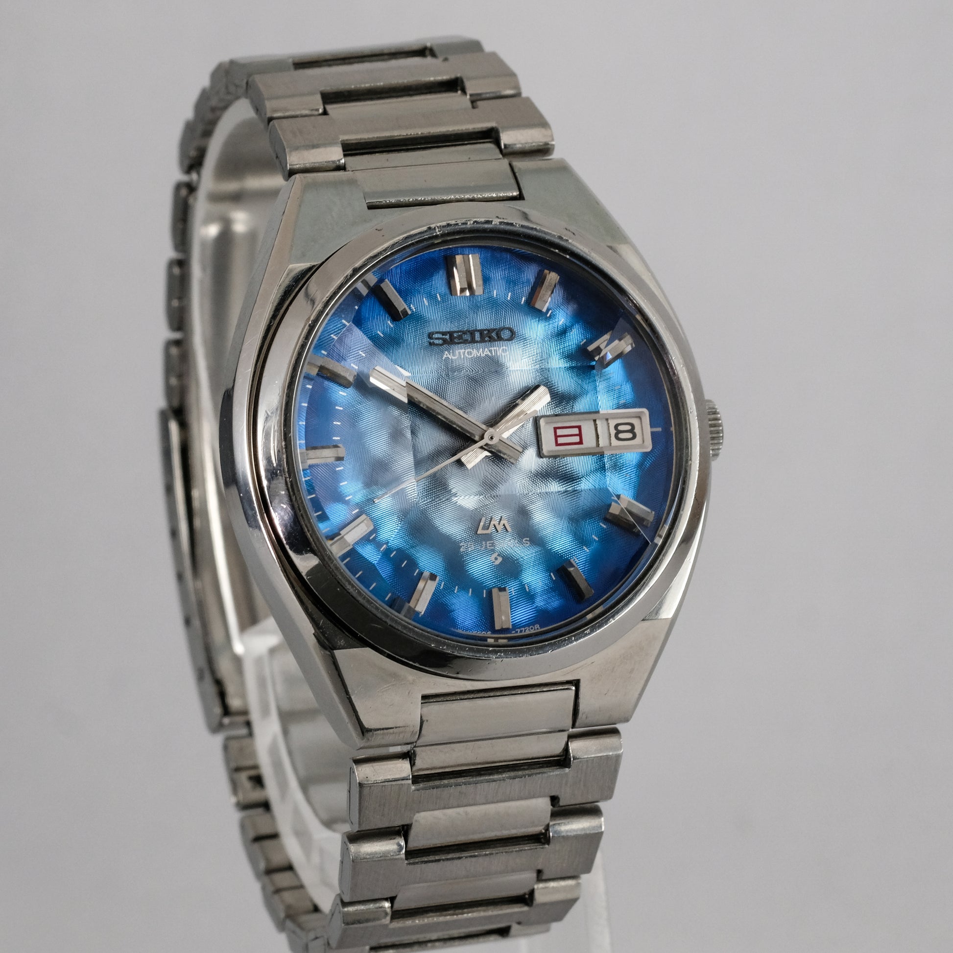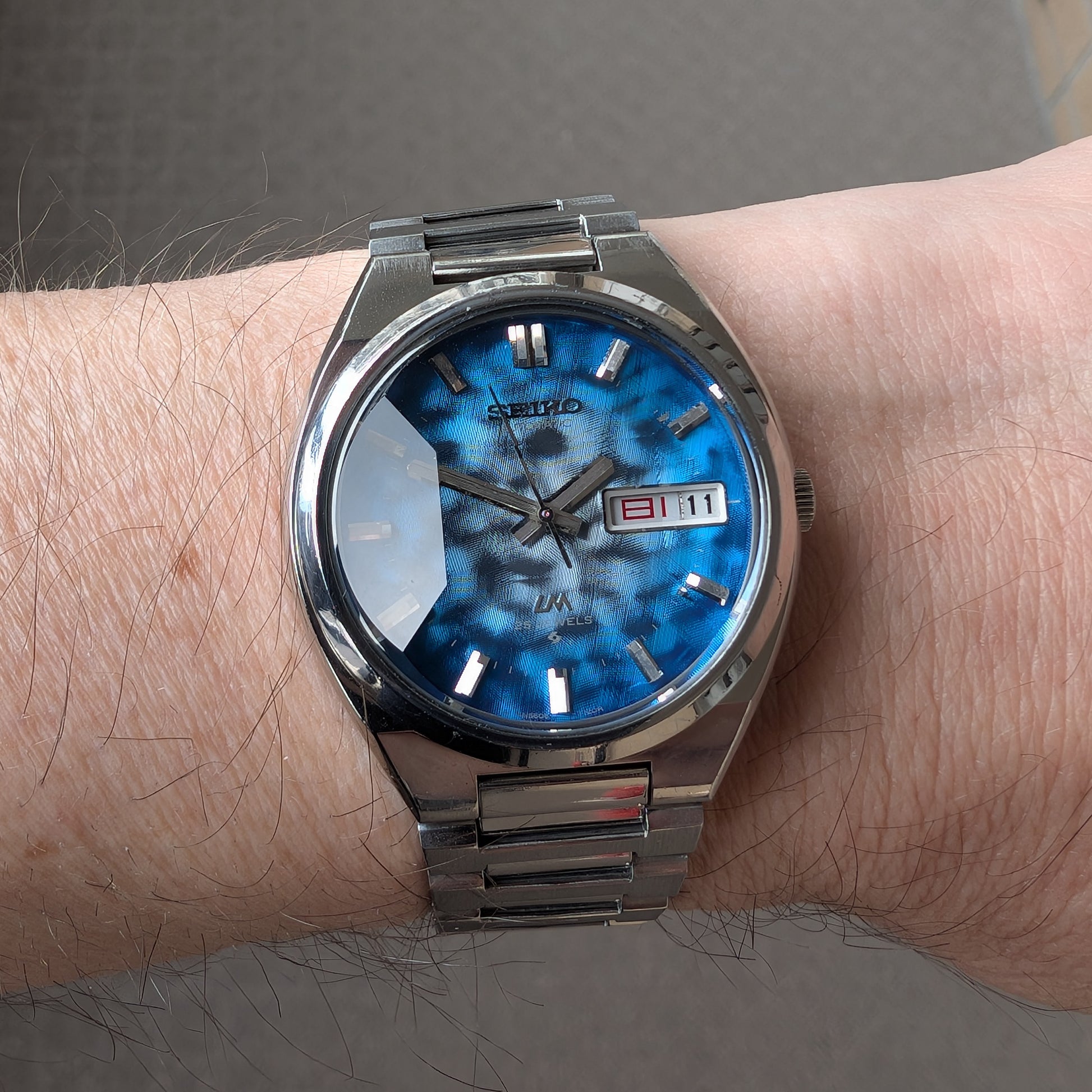 Serviced, 1974 Seiko LM 25 jewels automatic watch with very rare morpho blue dial, in pretty good condition.