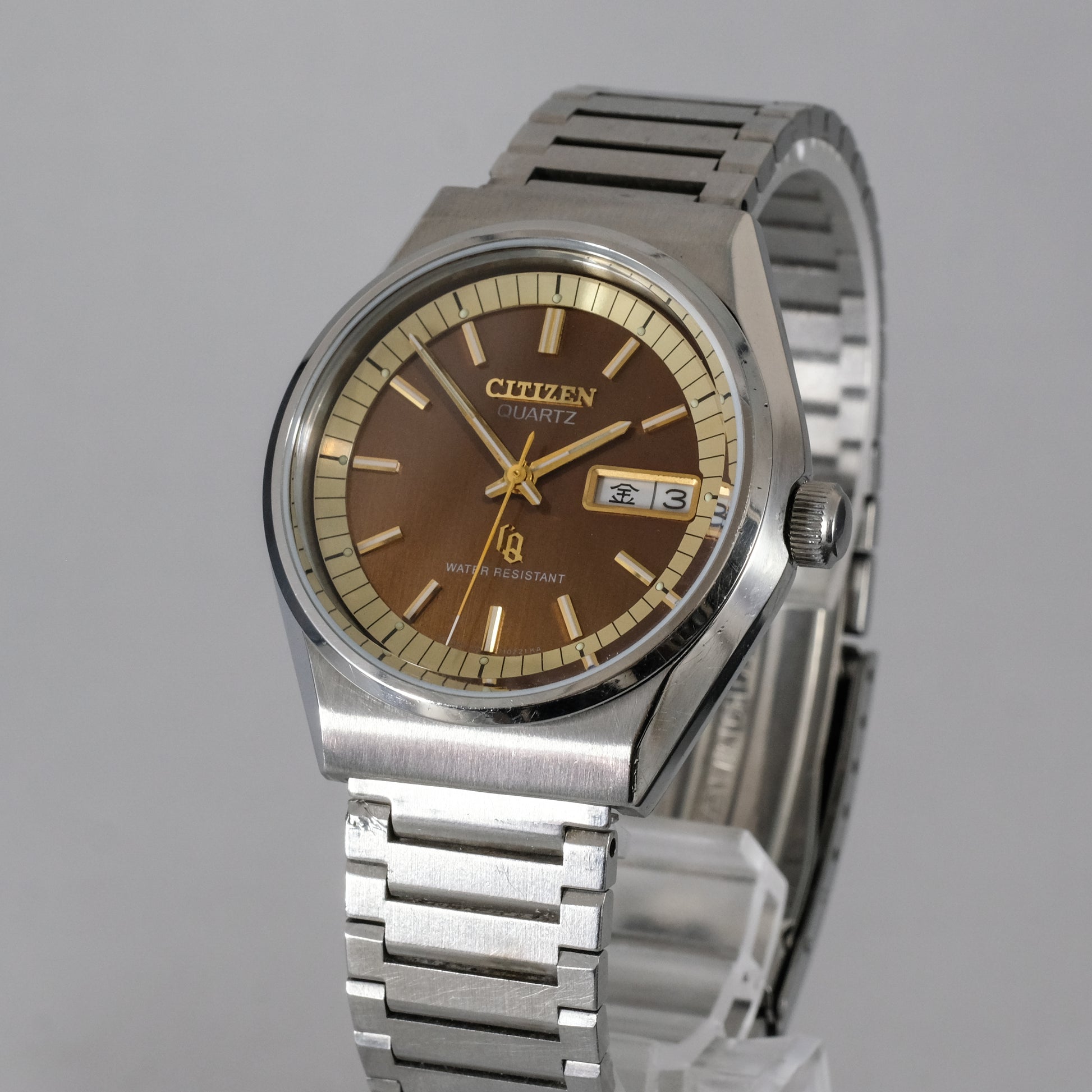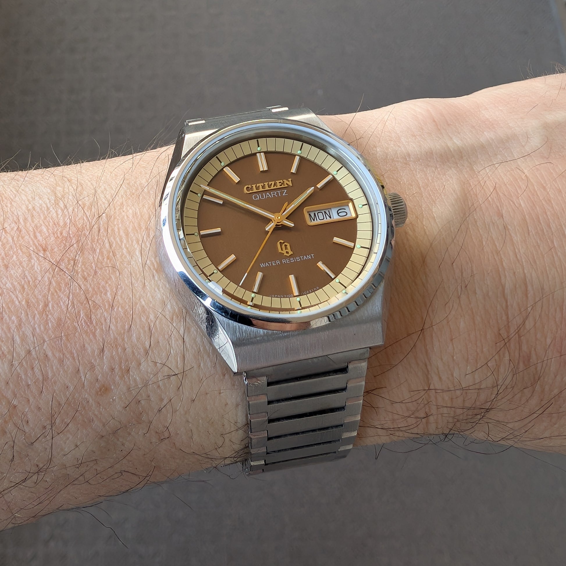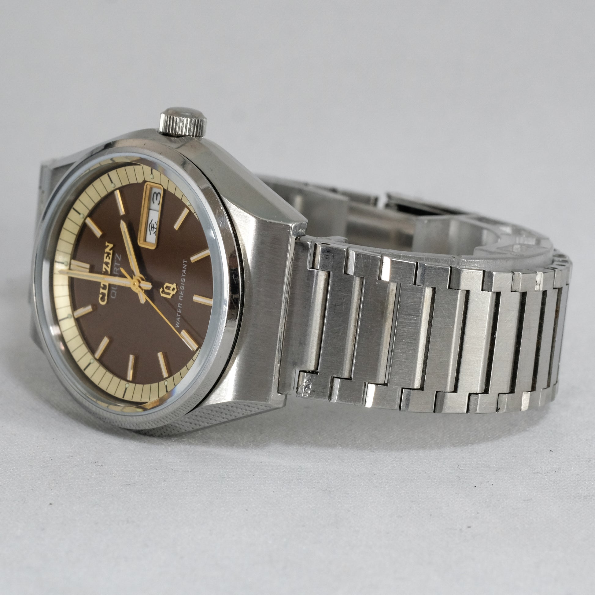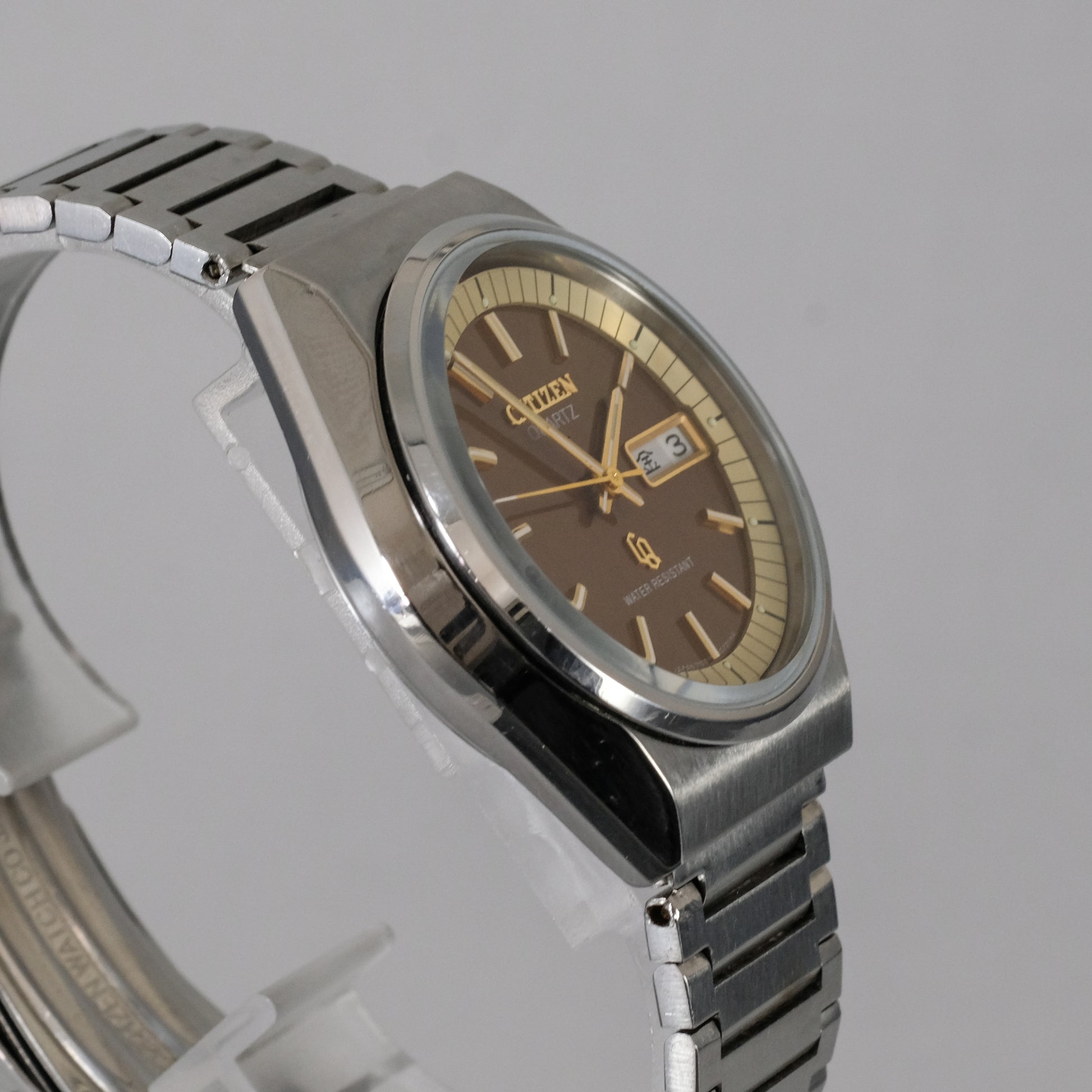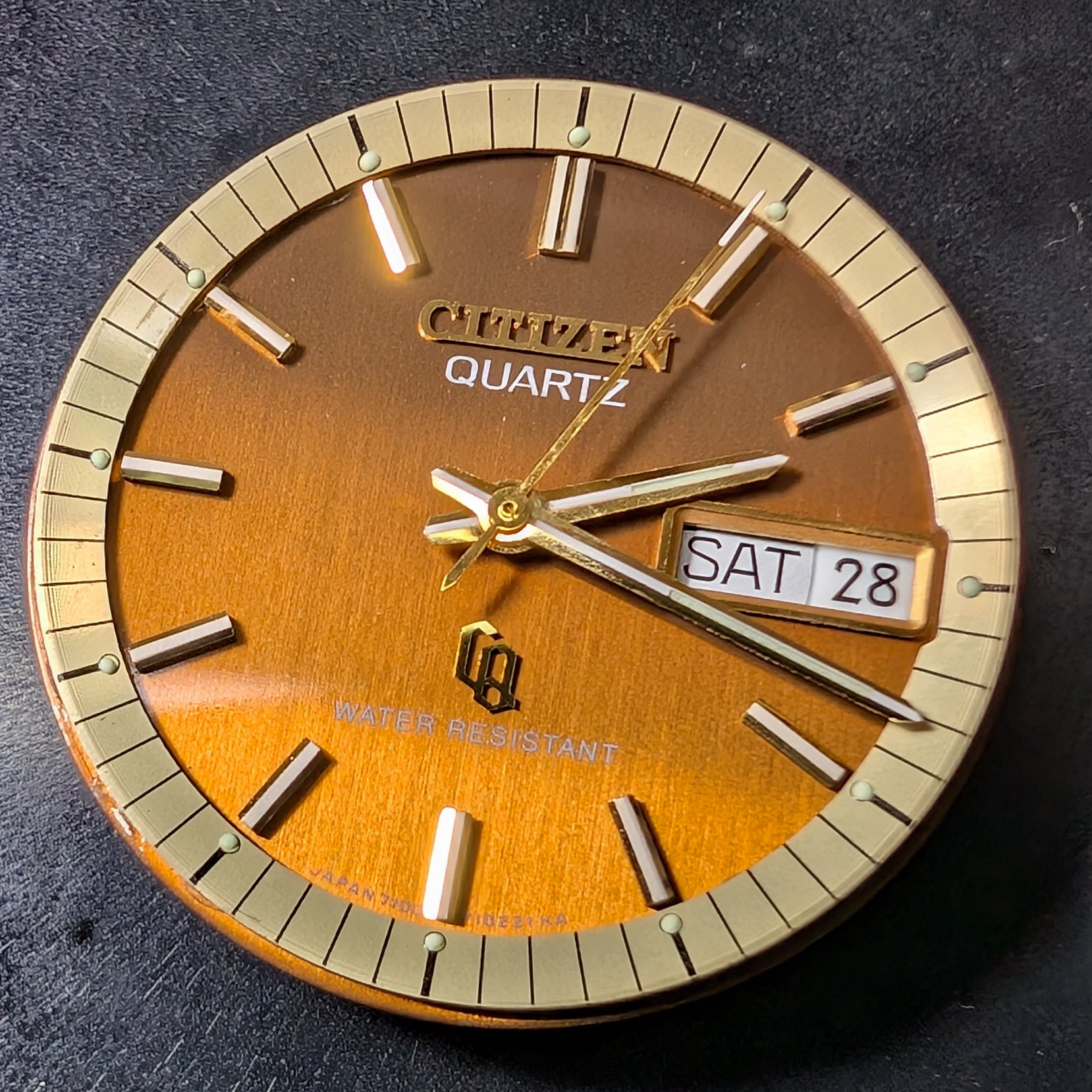 Beautiful, vertically brushed brown dial goes from light, metallic brown to warm chocolate brown depending on the angle. Applied indeces, Citizen and Crystron logos and surrounded by slanted, gold tone chapter ring.