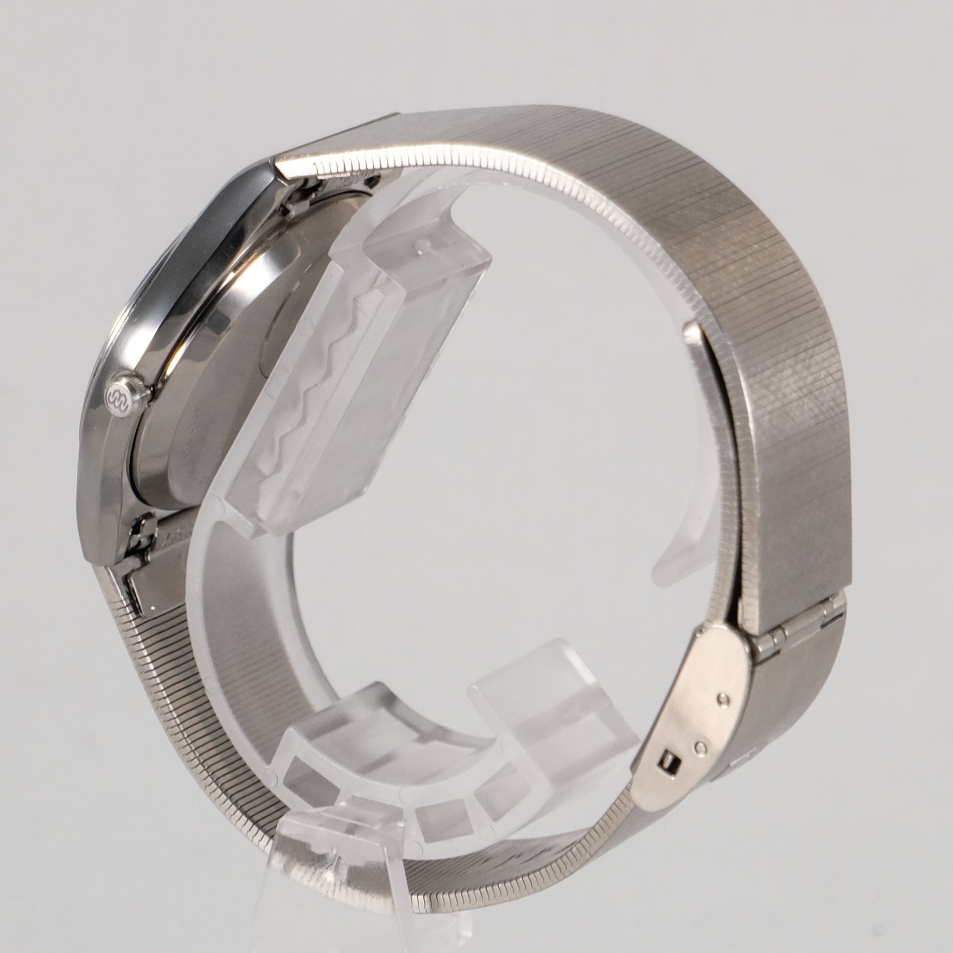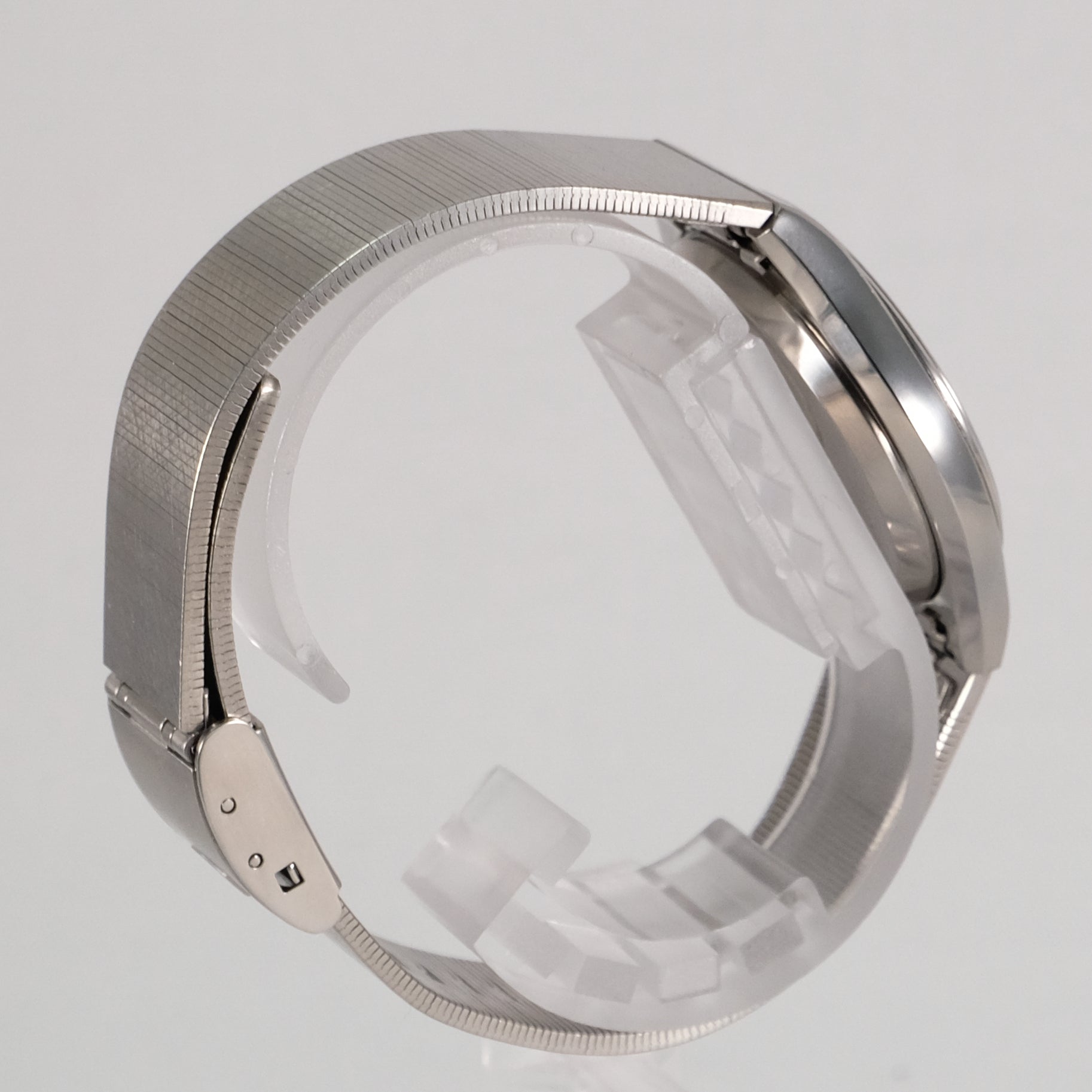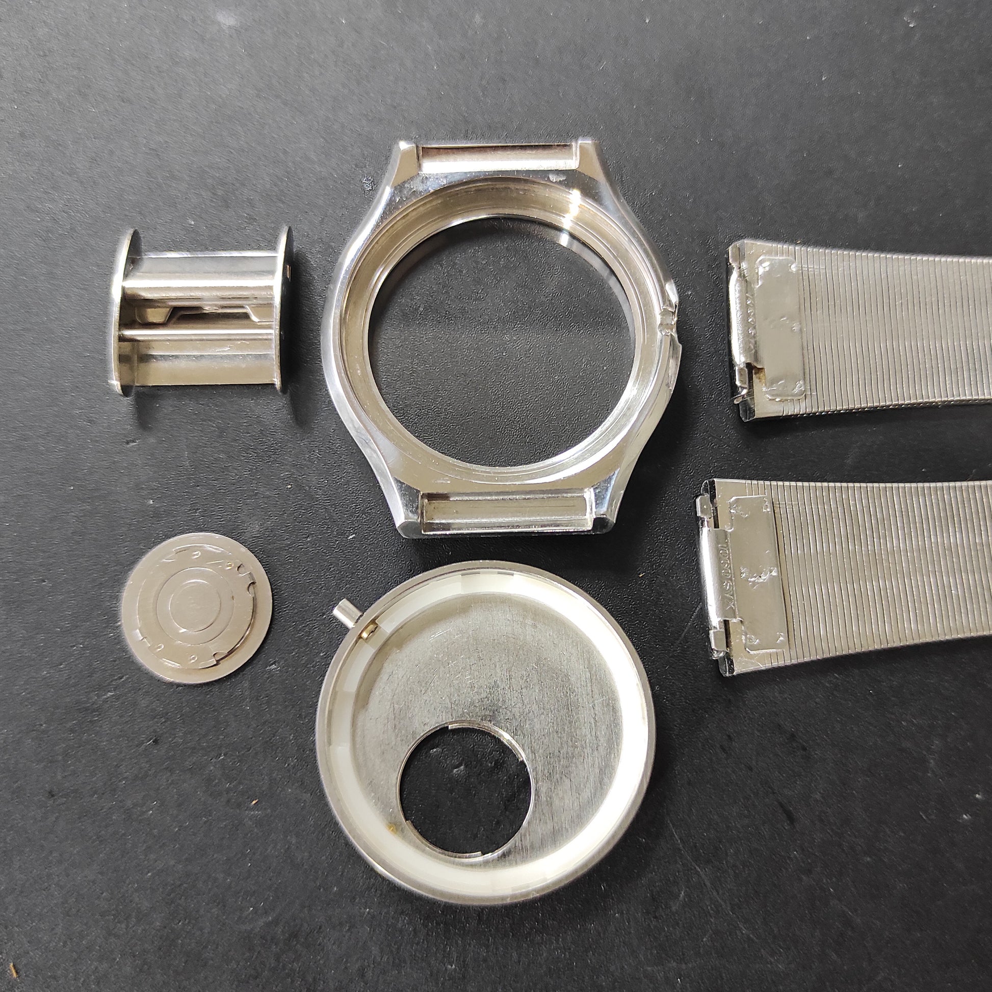 Seamlessly integrated, intricately finished stainless steel bracelet squeezes the case tightly and it's in excellent condition.