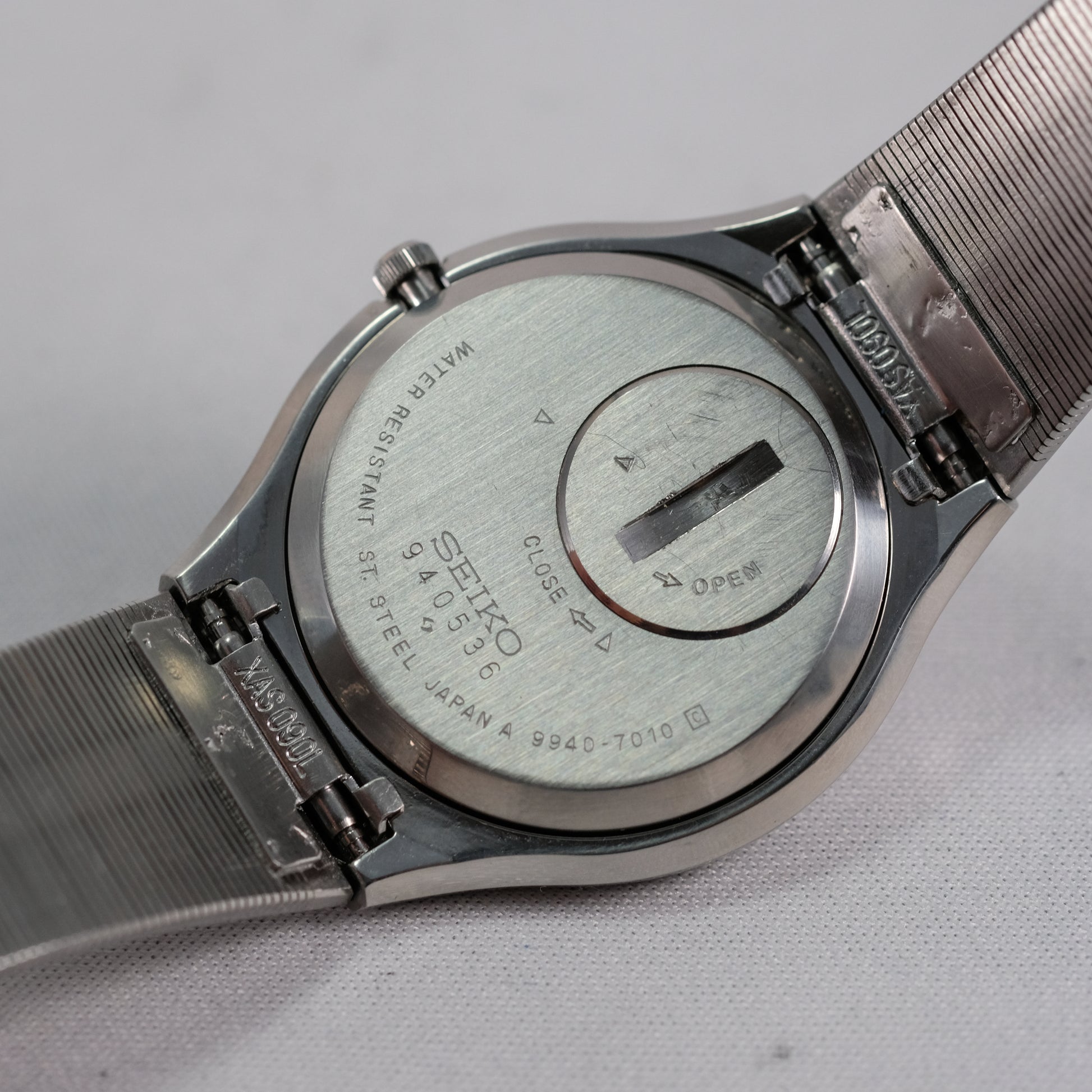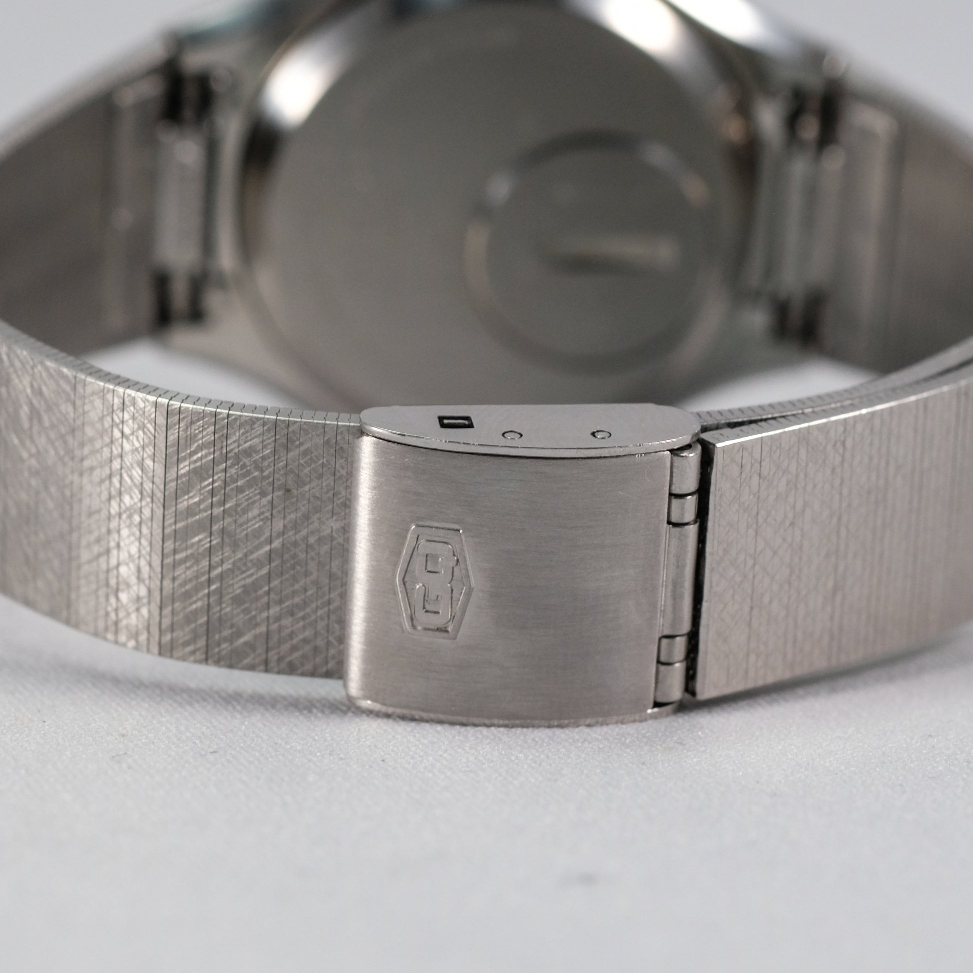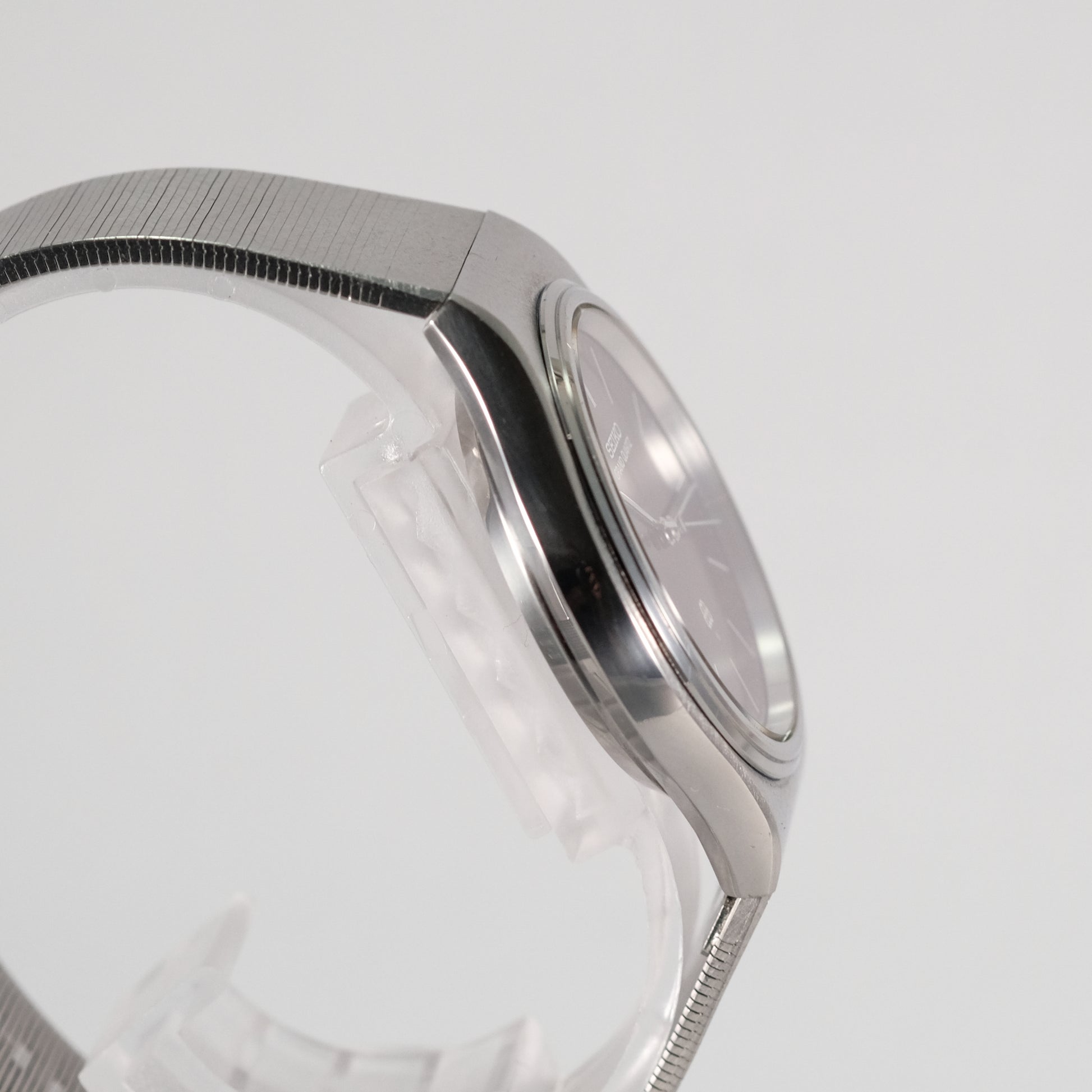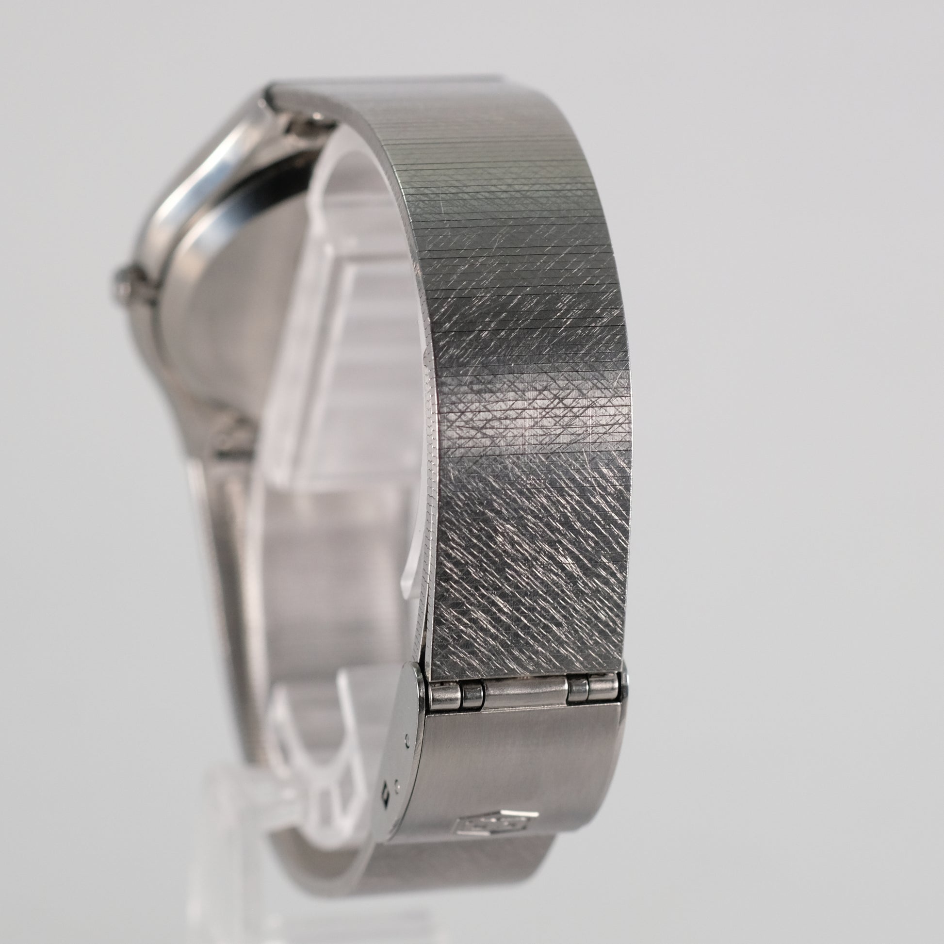 Seamlessly integrated, intricately finished stainless steel bracelet squeezes the case tightly and it's in excellent condition.