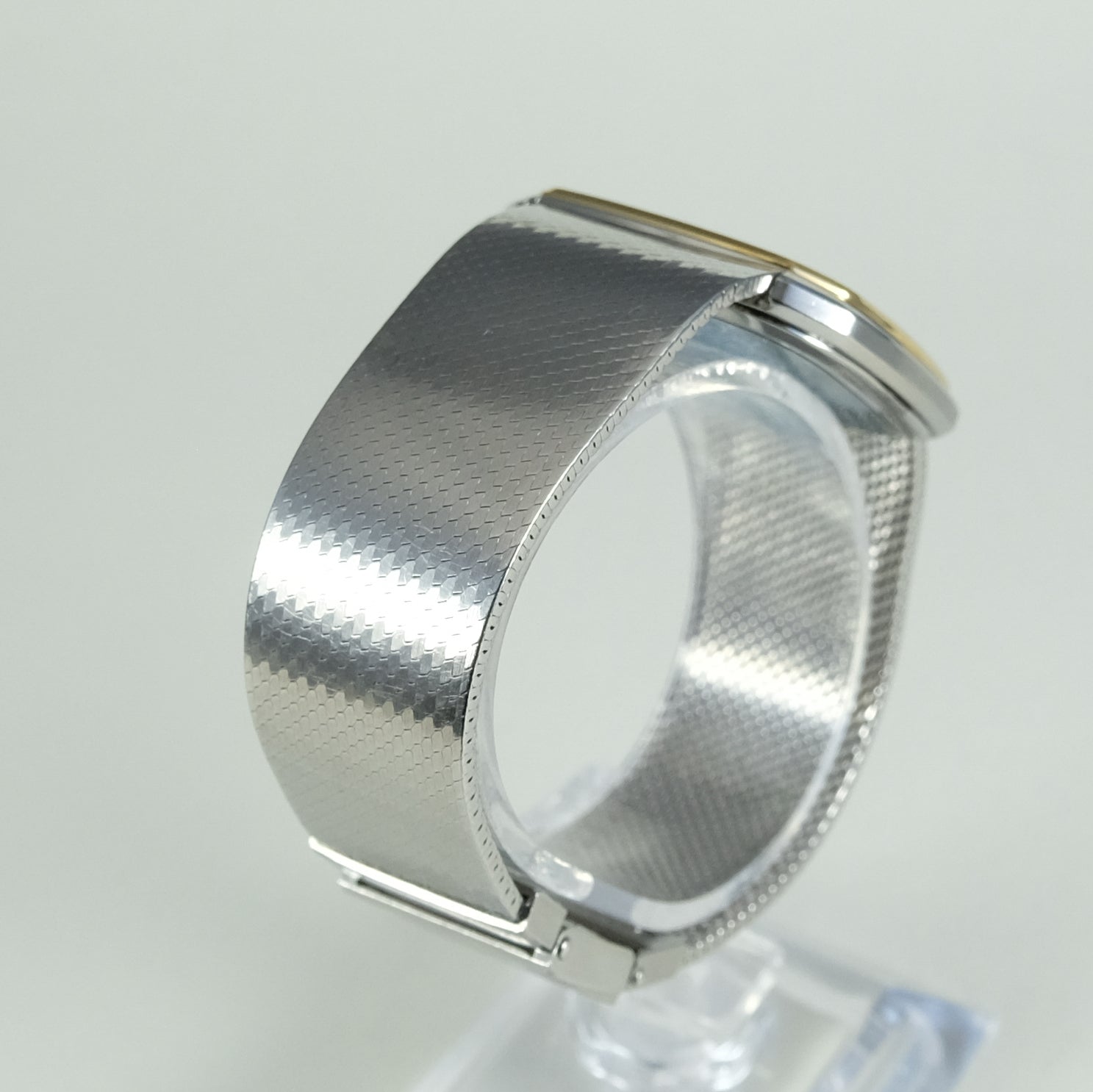 This model features stainless steel case with integrated snake skin like steel bracelet that can not be removed.