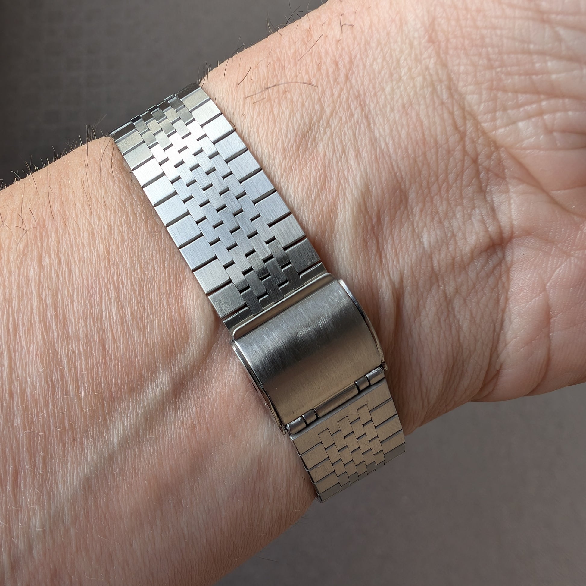 Stainless steel case has wonderfully integrated, full size stainless steel bracelet. There are some minor, barely noticeable scratches. Overall condition is very good.