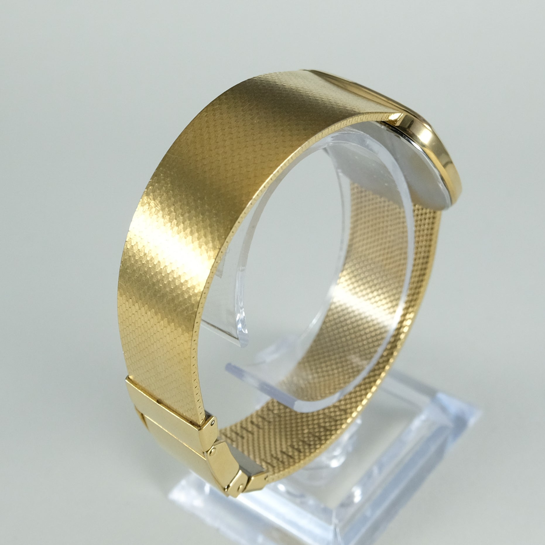 One piece, gold plated case and snake skin like gold plated steel bracelet are in very good condition. There are some small scratches on the caseback.