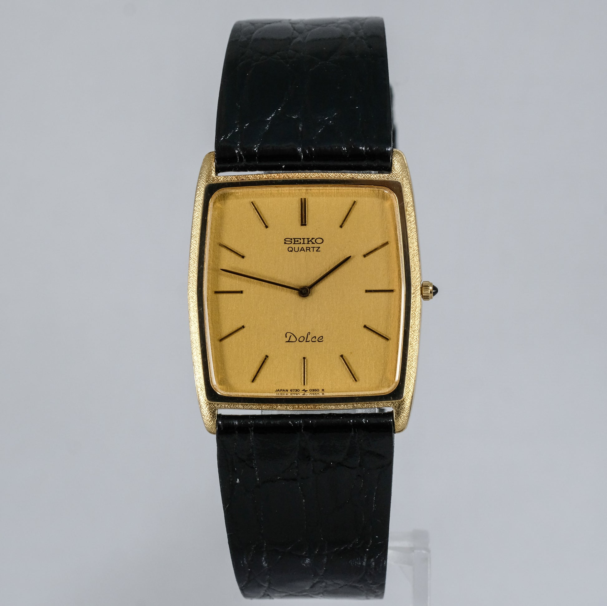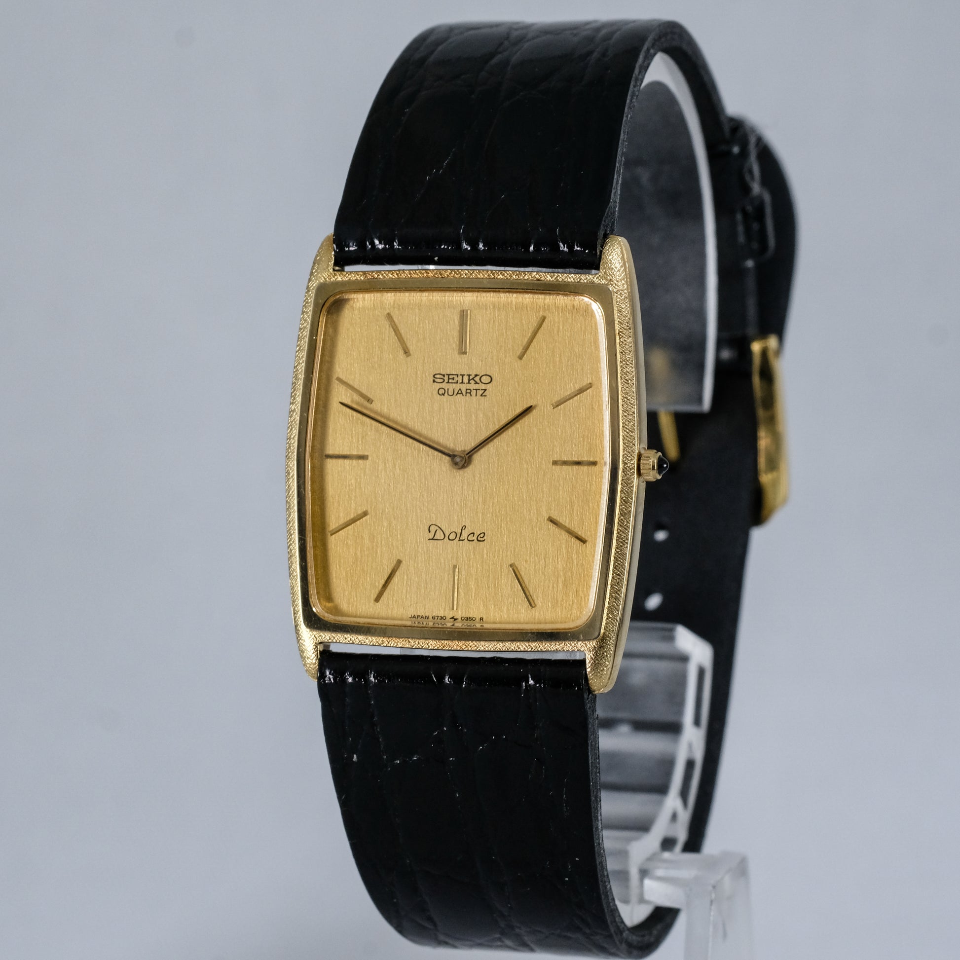 Comes on a new Seiko cowhide leather strap with original Dolce gold plated buckle.