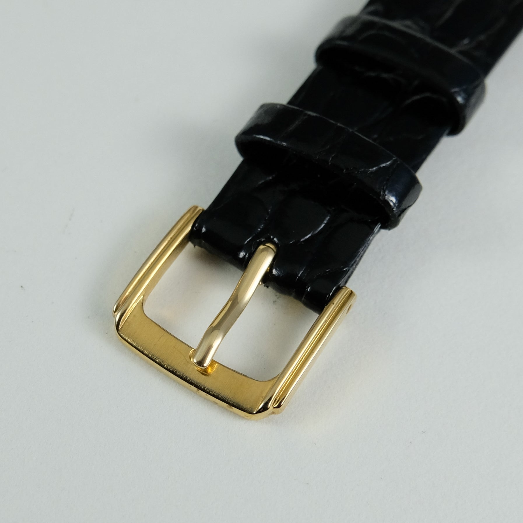 This one has a very nice tank style SGP 30 gold plated and stainless steel case with sapphire crystal. Both in near mint condition. At 25mm across, it's on smaller side and it's well suited for women and men with smaller wrists.