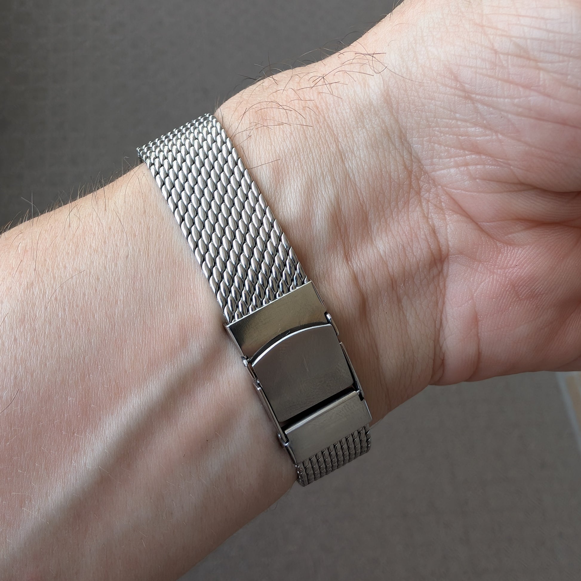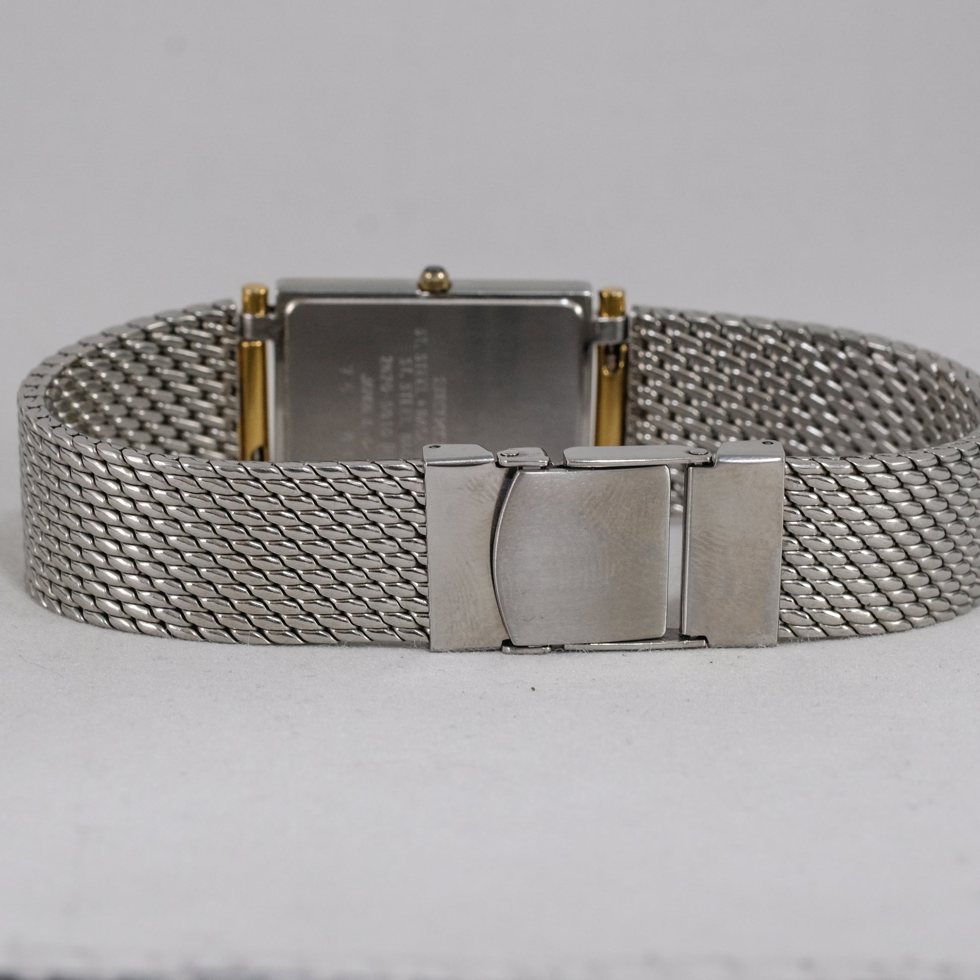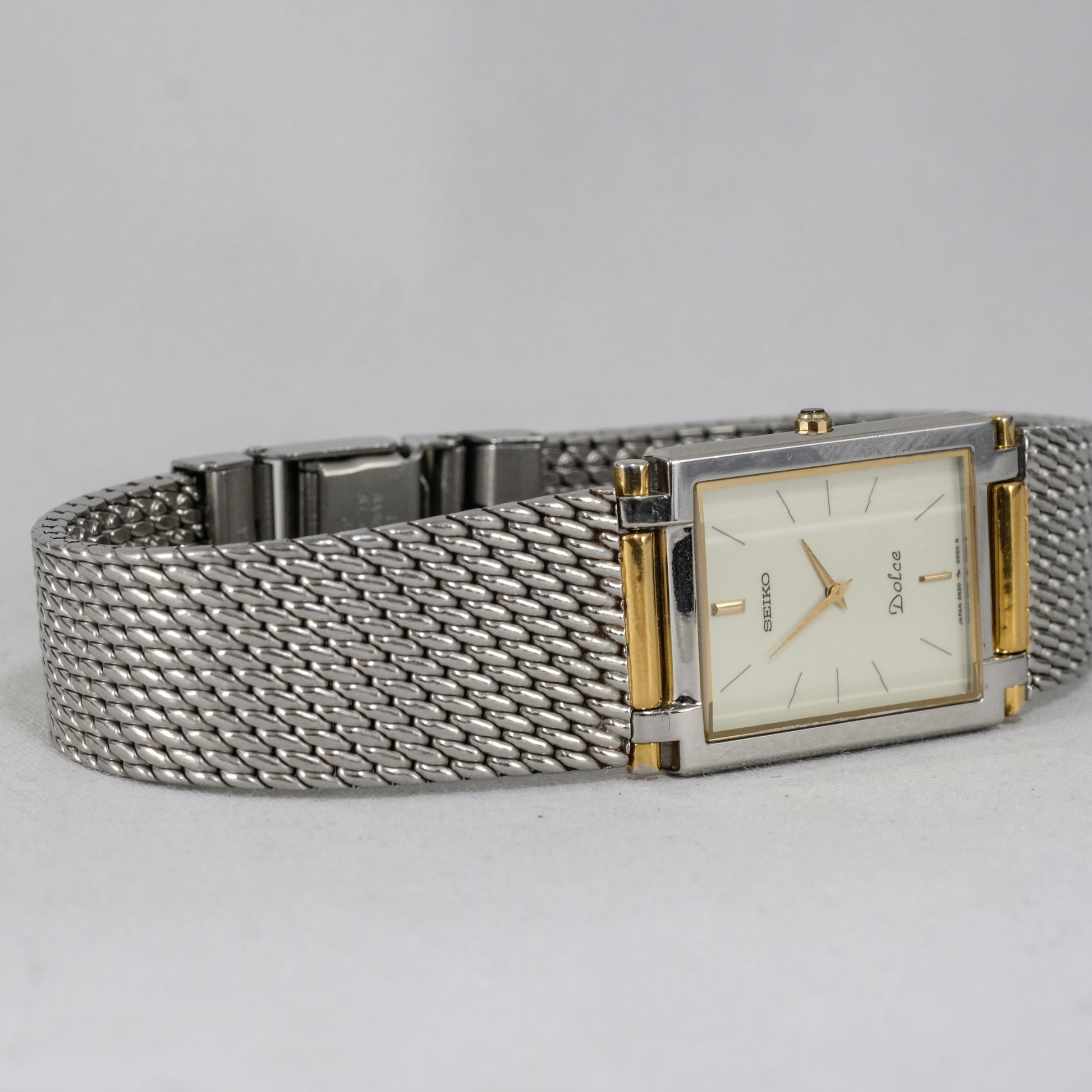 Featuring a clean, minimalist, ivory dial under faceted, (very unusual for Dolce) sapphire crystal, inside a stainless steel case with a superb mesh steel bracelet.
