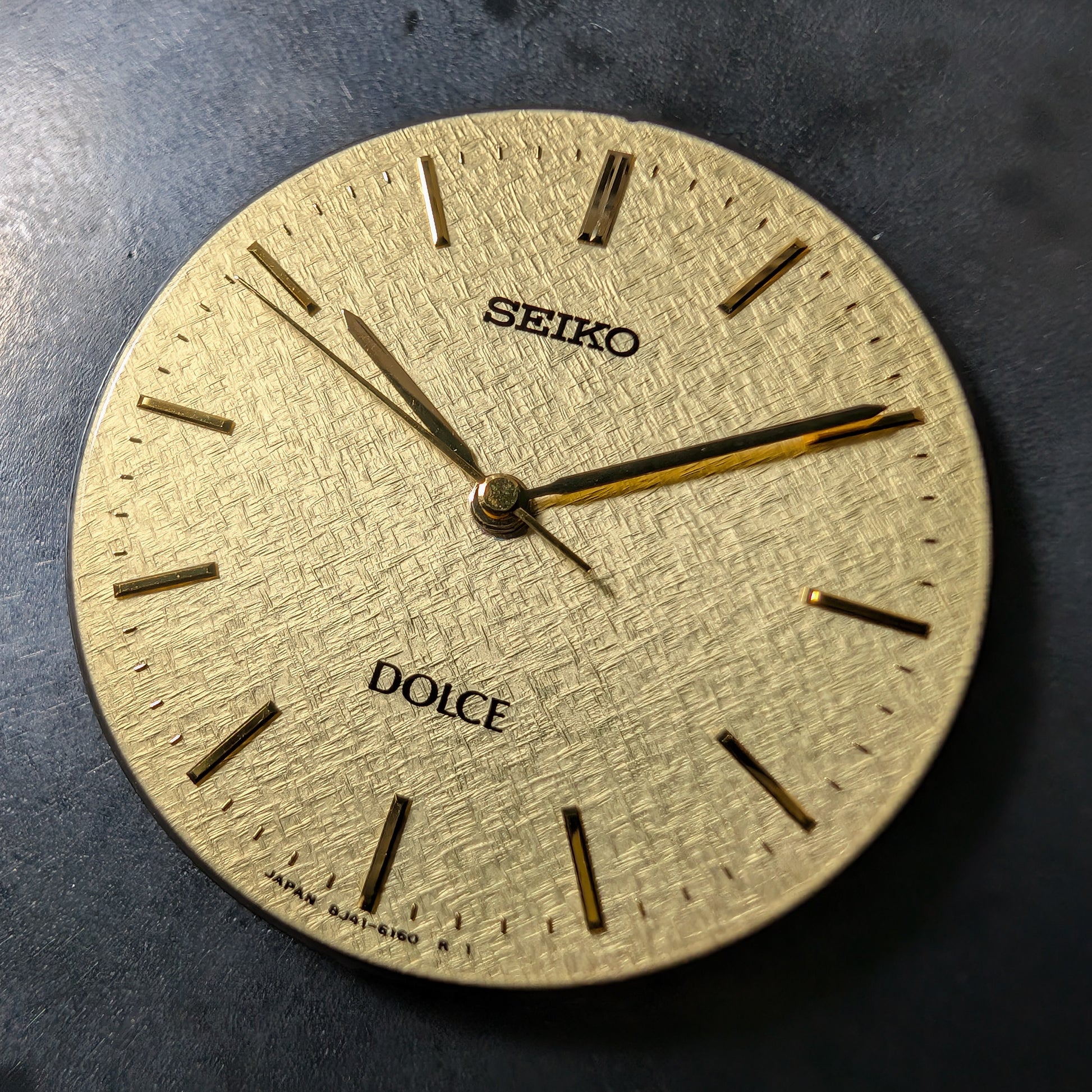 Expensive dial with "basket weave" texture and applied hour and minute markers.